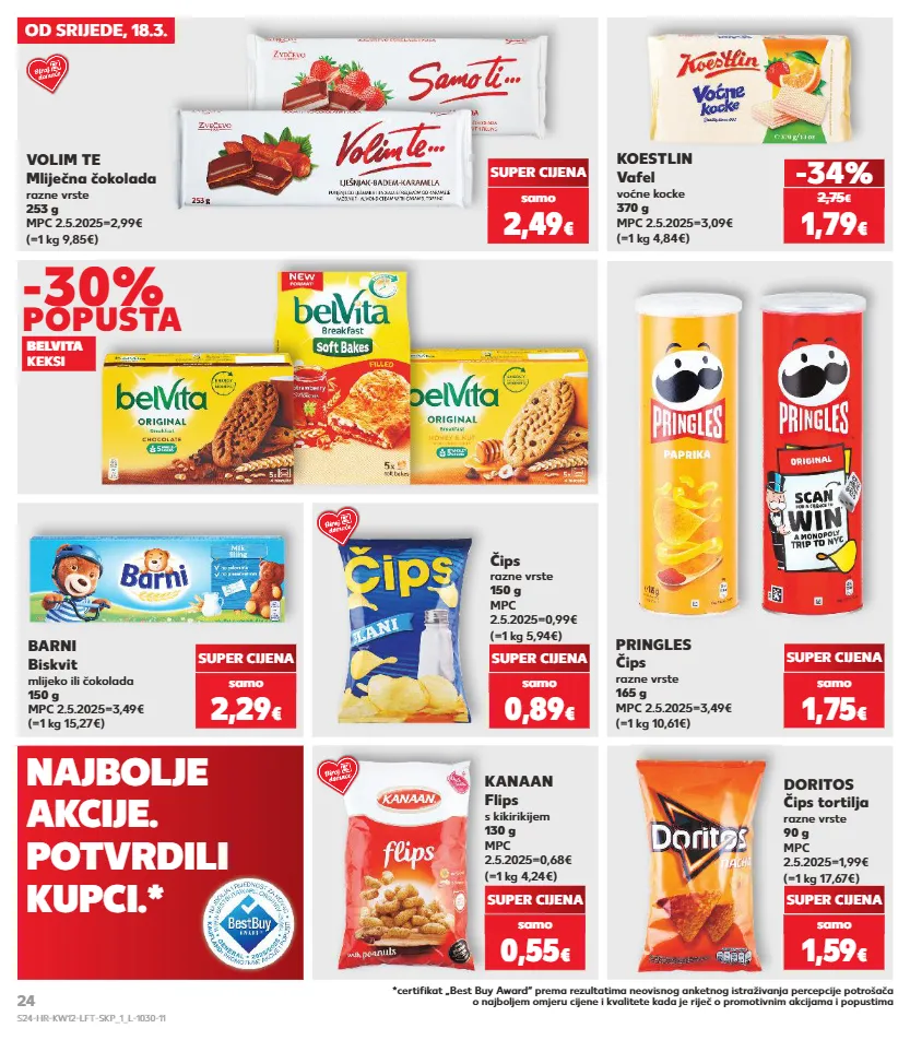 kratkotrajna ponuda kratkotrajna ponuda kratkotrajna ponuda kratkotrajna ponuda kratkotrajna ponuda kratkotrajna ponuda kratkotrajna ponuda samo samo samo samo samo samo samo od srijede, 18.3. pringles čips razne vrste 165 g mpc 2.5.2025=3,49€ (=1 kg 10,61€) koestlin vafel voćne kocke 370 g mpc 2.5.2025=3,09€ (=1 kg 4,84€) čips razne vrste 150 g mpc 2.5.2025=0,99€ (=1 kg 5,94€) kanaan flips s kikirikijem 130 g mpc 2.5.2025=0,68€ (=1 kg 4,24€) doritos čips tortilja razne vrste 90 g mpc 2.5.2025=1,99€ (=1 kg 17,67€) -34% super cijena super cijena super cijena super cijena barni biskvit mlijeko ili čokolada 150 g mpc 2.5.2025=3,49€ (=1 kg 15,27€) super cijena super cijena 2,49 € (=1 kg 9,85€) volim te mliječna čokolada razne vrste 253 g mpc 2.5.2025=2,99€ 1,79 € 2,75 € 1,75 € samo 0,89 € samo 0,55 € samo 1,59 € samo 2,29 € samo samo belvita keksi -30% popusta *certifikat „best buy award“ prema rezultatima neovisnog anketnog istraživanja percepcije potrošača o najboljem omjeru cijene i kvalitete kada je riječ o promotivnim akcijama i popustima najbolje akcije. potvrdili kupci.* s24-hr-kw12-lft-skp_1_l-1030-11 24