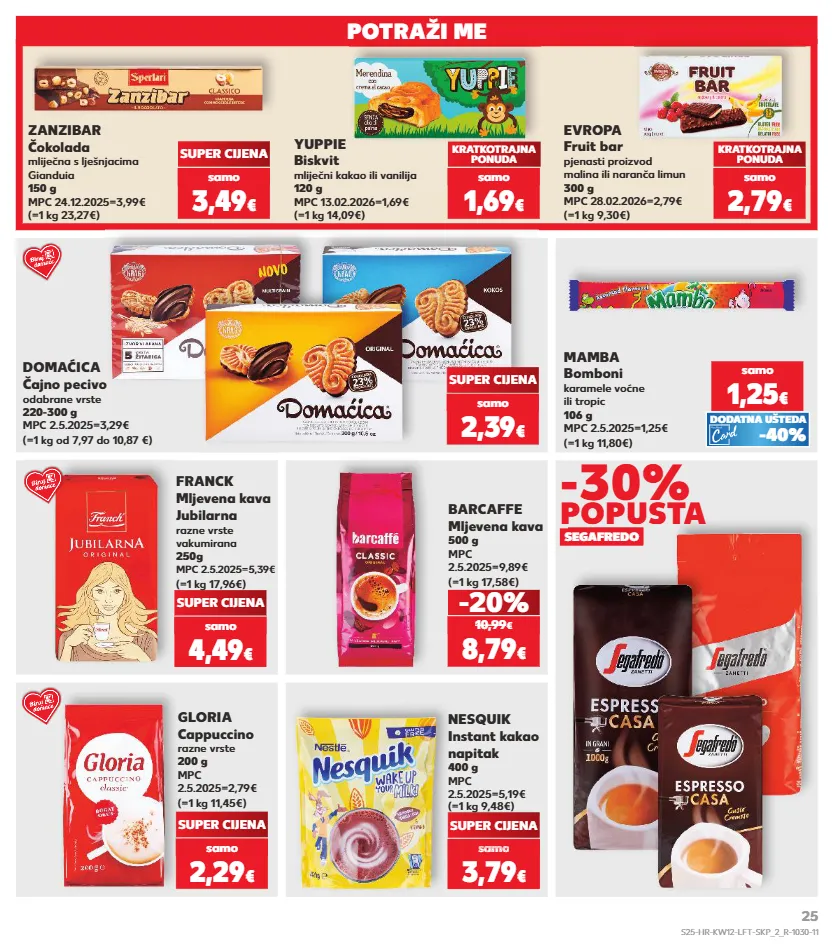 kratkotrajna ponuda kratkotrajna ponuda kratkotrajna ponuda kratkotrajna ponuda kratkotrajna ponuda samo samo samo samo samo samo samo kratkotrajna ponuda potraži me domaćica čajno pecivo odabrane vrste 220-300 g mpc 2.5.2025=3,29€ (=1 kg od 7,97 do 10,87 €) super cijena franck mljevena kava jubilarna razne vrste vakumirana 250g mpc 2.5.2025=5,39€ (=1 kg 17,96€) barcaffe mljevena kava 500 g mpc 2.5.2025=9,89€ (=1 kg 17,58€) super cijena -20% gloria cappuccino razne vrste 200 g mpc 2.5.2025=2,79€ (=1 kg 11,45€) super cijena (=1 kg 14,09€) yuppie biskvit mliječni kakao ili vanilija 120 g mpc 13.02.2026=1,69€ kratkotrajna ponuda (=1 kg 23,27€) zanzibar čokolada mliječna s lješnjacima gianduia 150 g mpc 24.12.2025=3,99€ super cijena (=1 kg 9,30€) evropa fruit bar pjenasti proizvod malina ili naranča limun 300 g mpc 28.02.2026=2,79€ kratkotrajna ponuda 2,39 € samo 4,49 € samo 8,79 € 10,99 € 2,29 € samo 1,69 € samo 3,49 € samo 2,79 € samo segafredo -30% popusta (=1 kg 9,48€) nesquik instant kakao napitak 400 g mpc 2.5.2025=5,19€ samo 3,79 € super cijena sa o 3,79 samo 3,79 samo 3,7 samo 3,79 sam samo € o € o (=1 kg 11,80€) mamba bomboni karamele voćne ili tropic 106 g mpc 2.5.2025=1,25€ samo 1,25 € -40% dodatna ušteda s25-hr-kw12-lft-skp_2_r-1030-11 25