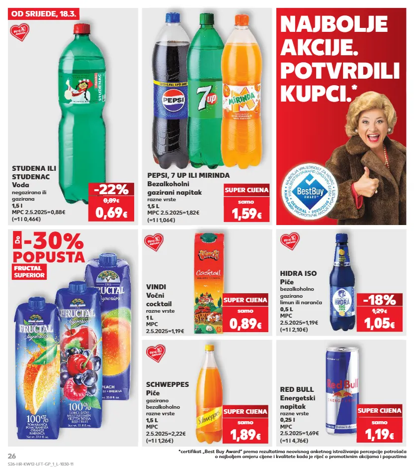 kratkotrajna ponuda kratkotrajna ponuda kratkotrajna ponuda kratkotrajna ponuda samo kratkotrajna ponuda samo samo samo samo kratkotrajna ponuda samo od srijede, 18.3. schweppes piće gazirano bezalkoholno razne vrste 1,5 l mpc 2.5.2025=2,22€ (=1 l 1,26€) hidra iso piće bezalkoholno gazirano limun ili naranča 0,5 l mpc 2.5.2025=1,19€ (=1 l 2,10€) red bull energetski napitak razne vrste 0,25 l mpc 2.5.2025=1,69€ (=1 l 4,76€) super cijena -18% super cijena -22% 0,69 € (=1 l 0,46€) studena ili studenac voda negazirana ili gazirana 1,5 l mpc 2.5.2025=0,88€ super cijena 1,89 € 1,05 € 1,29 € 1,19 € 0,89 € 0,89 € vindi voćni cocktail razne vrste 1 l mpc 2.5.2025=1,19€ popusta fructal superior samo samo samo pepsi, 7 up ili mirinda bezalkoholni gazirani napitak razne vrste 1,5 l mpc 2.5.2025=1,82€ (=1 l 1,06€) super cijena 1,59 € samo -30 % do najbolje akcije. potvrdili kupci. * *certifikat „best buy award“ prema rezultatima neovisnog anketnog istraživanja percepcije potrošača o najboljem omjeru cijene i kvalitete kada je riječ o promotivnim akcijama i popustima s26-hr-kw12-lft-gp_1_l-1030-11 26