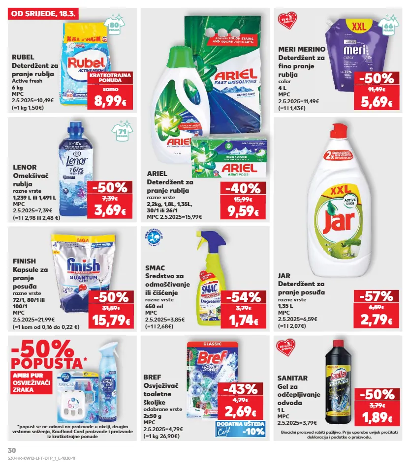 samo kratkotrajna ponuda samo kratkotrajna ponuda samo kratkotrajna ponuda samo kratkotrajna ponuda samo kratkotrajna ponuda samo kratkotrajna ponuda samo kratkotrajna ponuda samo kratkotrajna ponuda samo od srijede, 18.3. kratkotrajna ponuda 8,99 € (=1 kg 1,50€) rubel deterdžent za pranje rublja active fresh 6 kg mpc 2.5.2025=10,49€ finish kapsule za pranje posuđa razne vrste 72/1, 80/1 ili 100/1 mpc 2.5.2025=21,99€ (=1 kom od 0,16 do 0,22 €) -50% 15,79 € 31,59 € smac sredstvo za odmašćivanje ili čišćenje razne vrste 650 ml mpc 2.5.2025=3,85€ (=1 l 2,68€) -54% 1,74 € 3,79 € sanitar gel za odčepljivanje odvoda 1 l mpc 2.5.2025=3,79€ biocidni proizvod rabiti pažljivo. prije uporabe uvijek pročitati deklaraciju i podatke o proizvodu. -50% 1,89 € 3,79 € -57% (=1 l 2,07€) jar deterdžent za pranje posuđa razne vrste 1,35 l mpc 2.5.2025=6,59€ 2,79 € 6,59 € *popust se ne odnosi na proizvode u akciji, drugim vrstama sniženja, kaufland card proizvode i proizvode iz kratkotrajne ponude ambi pur osvježivači zraka -50% popusta * ariel deterdžent za pranje rublja razne vrste 2,2kg, 1,8l, 1,35l, 30/1 ili 26/1 mpc 2.5.2025=15,99€ 9,59 € -40% 15,99 € (=1 kg 26,90€) bref osvježivač toaletne školjke odabrane vrste 2x50 g mpc 2.5.2025=4,79€ 2,69 € -43% 4,79 € -10% dodatna ušteda samo 80 pranja -50% 5,69 € 11,49 € (=1 l 1,43€) meri merino deterdžent za fino pranje rublja color 4 l mpc 2.5.2025=11,49€ 66 pranja (=1 l 2,98 ili 2,48 €) lenor omekšivač rublja razne vrste 1,239 l ili 1,491 l mpc 2.5.2025=7,39€ 3,69 € -50% 7,39 € 71 pranja s30-hr-kw12-lft-dtp_1_l-1030-11 30