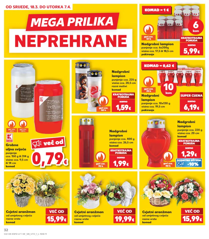 kratkotrajna ponuda neprehrane neprehrane mega prilika od srijede, 18.3. do utorka 7.4. nadgrobni lampion punjenje cca. 400 g visina cca. 26,5 cm komad nadgrobni lampion punjenje cca. 225 g visina cca. 20,5 cm razni motivi komad nadgrobni lampion punjenje cca. 6x200g visina cca. 17,5 ili 18,5 cm pakiranje cvjetni aranžman od umjetnog cvijeća razne vrste komad kratkotrajna ponuda kratkotrajna ponuda kratkotrajna ponuda cvjetni aranžman od umjetnog cvijeća razne vrste komad samo 1,59 € samo 1,99 € samo 5,99 € gori cca. 50 h gori cca. 70 h gori cca. 32 h 6 kom nadgrobni lampion punjenje cca. 220 g visina cca. 20 cm komad kratkotrajna ponuda samo 1,29 € gori cca. 40 h -10% dodatna ušteda cvjetni aranžman od umjetnog cvijeća razne vrste komad već od 15,99 € već od 15,99 € već od 19,99 € 0,7 9 0,79 € € ve ć od grobna uljna svijeća punjenje cca. 150 g ili 314 g visine cca. 9,5 cm ili 14 cm komad komad = 1 € super cijena samo 6,19 € gori cca. 25 h nadgrobni lampion punjenje cca. 10x130 g visina cca. 19,5 cm pakiranje 10 kom komad = 0,62 € s32-hr-kw12-lft-nf_sri_uto_1_l-1030-11 32