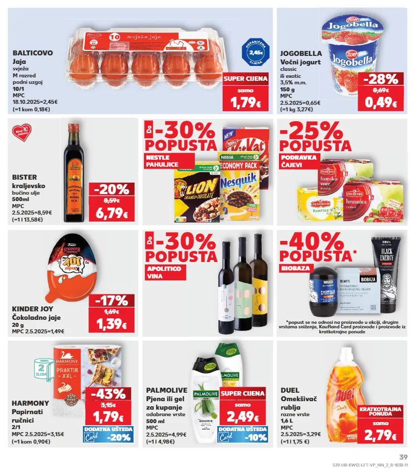 2,49 € kratkotrajna ponuda kratkotrajna ponuda kratkotrajna ponuda samo samo samo kratkotrajna ponuda samo samo kratkotrajna ponuda kratkotrajna ponuda samo *popust se ne odnosi na proizvode u akciji, drugim vrstama sniženja, kaufland card proizvode i proizvode iz kratkotrajne ponude (=1 kg 3,27€) jogobella voćni jogurt classic ili exotic 3,5% m.m. 150 g mpc 2.5.2025=0,65€ -28% super cijena kinder joy čokoladno jaje 20 g mpc 2.5.2025=1,49€ -17% 1,39 € 1,69 € duel omekšivač rublja razne vrste 1,6 l mpc 2.5.2025=3,29€ (=1 l 1,75 €) kratkotrajna ponuda 2,79 € 0,49 € 0,69 € (=1 l 13,58€) bister kraljevsko bučino ulje 500ml mpc 2.5.2025=8,59€ -20% 6,79 € 8,59 € 1,79 € (=1 kom 0,18€) balticovo jaja svježa m razred podni uzgoj 10/1 mpc 18.10.2025=2,45€ nestle pahuljice podravka čajevi -25% popusta biobaza -40% popusta * (=1 l 4,98€) palmolive pjena ili gel za kupanje odabrane vrste 500 ml mpc 2.5.2025=4,99€ (=1 kom 0,90€) harmony papirnati ručnici 2/1 mpc 2.5.2025=3,15€ samo 2,49 € super cijena -43% 1,79 € 3,15 € -20% dodatna ušteda -10% dodatna ušteda samo -30 % popusta do apolitico vina popusta -30 % do 2 sloja 2,45 € samo s39-hr-kw12-lft-vp_nn_2_r-1030-11 39