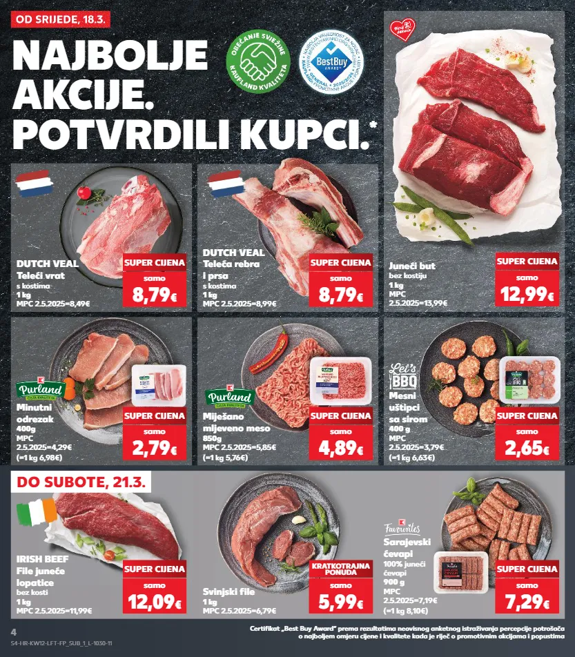 kratkotrajna ponuda kratkotrajna ponuda kratkotrajna ponuda kratkotrajna ponuda kratkotrajna ponuda kratkotrajna ponuda kratkotrajna ponuda kratkotrajna ponuda od srijede, 18.3. od srijede, 18.3. do subote, 21.3. dutch veal teleća rebra i prsa s kostima 1 kg mpc 2.5.2025=8,99€ dutch veal teleći vrat s kostima 1 kg mpc 2.5.2025=8,49€ minutni odrezak 400g mpc 2.5.2025=4,29€ (=1 kg 6,98€) mesni uštipci sa sirom 400 g mpc 2.5.2025=3,79€ (=1 kg 6,63€) miješano mljeveno meso 850g mpc 2.5.2025=5,85€ (=1 kg 5,76€) irish beef file juneće lopatice bez kosti 1 kg mpc 2.5.2025=11,99€ svinjski file 1 kg mpc 2.5.2025=6,79€ sarajevski ćevapi 100% juneći ćevapi 900 g mpc 2.5.2025=7,19€ (=1 kg 8,10€) č i s t a k v a l i t e t a č i s t a k v a l i t e t a super cijena super cijena super cijena super cijena super cijena kratkotrajna ponuda super cijena super cijena super cijena juneći but bez kostiju 1 kg mpc 2.5.2025=13,99€ samo 8,79 € samo 8,79 € samo 2,79 € samo 2,65 € samo 12,09 € samo 5,99 € samo 7,29 € samo 4,89 € samo 12,99 € najbolje akcije. potvrdili kupci. * certifikat „best buy award“ prema rezultatima neovisnog anketnog istraživanja percepcije potrošača o najboljem omjeru cijene i kvalitete kada je riječ o promotivnim akcijama i popustima s4-hr-kw12-lft-fp_sub_1_l-1030-11 4