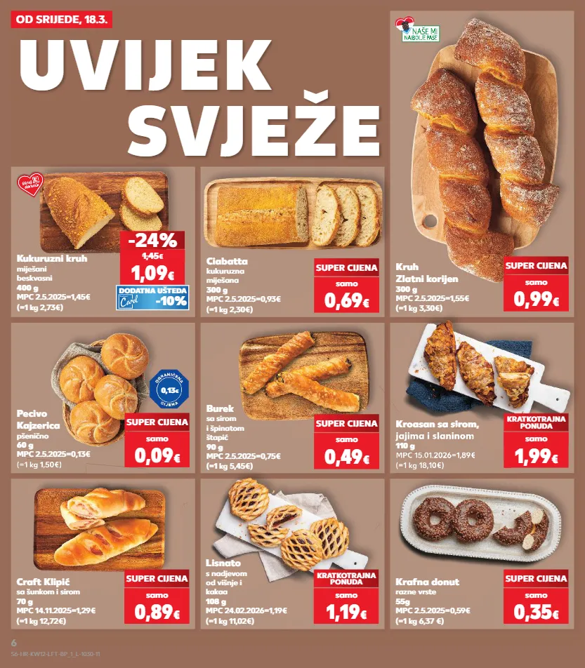 kratkotrajna ponuda kratkotrajna ponuda kratkotrajna ponuda kratkotrajna ponuda kratkotrajna ponuda kratkotrajna ponuda kratkotrajna ponuda samo svježe svježe uvijek od srijede, 18.3. ciabatta kukuruzna miješana 300 g mpc 2.5.2025=0,93€ (=1 kg 2,30€) pecivo kajzerica pšenično 60 g mpc 2.5.2025=0,13€ (=1 kg 1,50€) super cijena super cijena super cijena (=1 kg 3,30€) kruh zlatni korijen 300 g mpc 2.5.2025=1,55€ kratkotrajna ponuda samo 1,99 € (=1 kg 18,10€) kroasan sa sirom, jajima i slaninom 110 g mpc 15.01.2026=1,89€ super cijena samo 0,69 € (=1 kg 18,10€) (=1 kg 18,10€) kroasan sa sirom, jajima i slaninom mpc 15.01.2026=1,89€ krafna donut razne vrste 55g mpc 2.5.2025=0,59€ (=1 kg 6,37 €) super cijena samo 0,35 € (=1 kg 1,50€) craft klipić sa šunkom i sirom 70 g mpc 14.11.2025=1,29€ (=1 kg 12,72€) super cijena samo 0,89 € lisnato s nadjevom od višnje i kakaa 108 g mpc 24.02.2026=1,19€ (=1 kg 11,02€) kratkotrajna ponuda samo 1,19 € samo 0,09 € samo 0,99 € samo 0,49 € (=1 kg 5,45€) burek sa sirom i špinatom štapić 90 g mpc 2.5.2025=0,75€ (=1 kg 2,73€) kukuruzni kruh miješani beskvasni 400 g mpc 2.5.2025=1,45€ 1,09 € -24% 1,45 € -10% dodatna ušteda 0,13 € s6-hr-kw12-lft-bp_1_l-1030-11 6