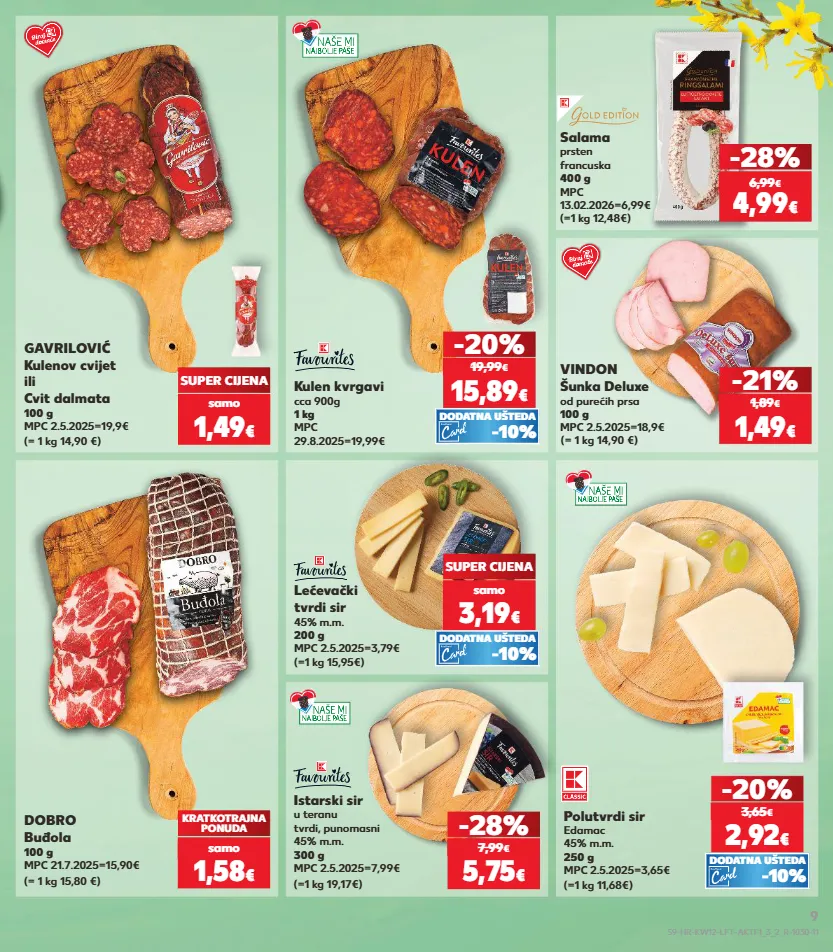 3,89 € -17% samo kratkotrajna ponuda kratkotrajna ponuda samo kratkotrajna ponuda samo kratkotrajna ponuda kratkotrajna ponuda samo kratkotrajna ponuda kratkotrajna ponuda samo dobro buđola 100 g mpc 21.7.2025=15,90€ (= 1 kg 15,80 €) gavrilović kulenov cvijet ili cvit dalmata 100 g mpc 2.5.2025=19,9€ (= 1 kg 14,90 €) kratkotrajna ponuda super cijena istarski sir u teranu tvrdi, punomasni 45% m.m. 300 g mpc 2.5.2025=7,99€ (=1 kg 19,17€) -28% vindon šunka deluxe od purećih prsa 100 g mpc 2.5.2025=18,9€ (= 1 kg 14,90 €) salama prsten francuska 400 g mpc 13.02.2026=6,99€ (=1 kg 12,48€) samo 1,58 € samo 1,49 € 5,75 € 7,99 € -21% 1,49 € 1,89 € 6,99 € -28% 4,99 € (=1 kg 11,68€) polutvrdi sir edamac 45% m.m. 250 g mpc 2.5.2025=3,65€ 2,92 € -20% 3,65 € -10% dodatna ušteda (=1 kg 15,95€) lećevački tvrdi sir 45% m.m. 200 g mpc 2.5.2025=3,79€ samo 3,19 € super cijena -10% dodatna ušteda kulen kvrgavi cca 900g 1 kg mpc 29.8.2025=19,99€ 15,89 € -20% 19,99 € -10% dodatna ušteda s9-hr-kw12-lft-aktf1_3_2_r-1030-11 9