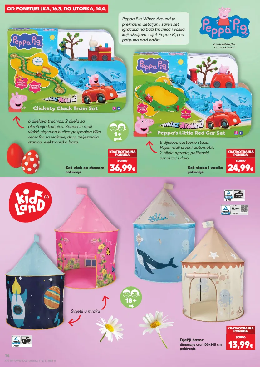 OD PONEDJELJKA, 16.3. DO UTORKA, 14.4. Dječji šator dimenzije cca. 100x145 cm pakiranje Set vlak sa stazom pakiranje Set staza i vozila pakiranje KRATKOTRAJNA PONUDA samo 13,99 € KRATKOTRAJNA PONUDA samo 36,99 € KRATKOTRAJNA PONUDA samo 24,99 € 18 + mj. Svijetli u mraku 1 + god. Peppa Pig Whizz-Around je prekrasno detaljan i šaren set igračaka na bazi tračnica i vozila, koji oživljava svijet Peppe Pig na potpuno novi način! 8 dijelova cestovne staze, Pepin mali crveni automobil, 2 bijele ograde, poštanski sandučić i drvo. 6 dijelova tračnica, 2 dijela za okretanje tračnica, Rebeccin mali vlakić, signalna kućica gospodina Bika, semafor za vlakove, drvo, željeznička stanica, elektronička baza. S14-HR-KW12-OC3-Online3_1_13_L-1030-11 14