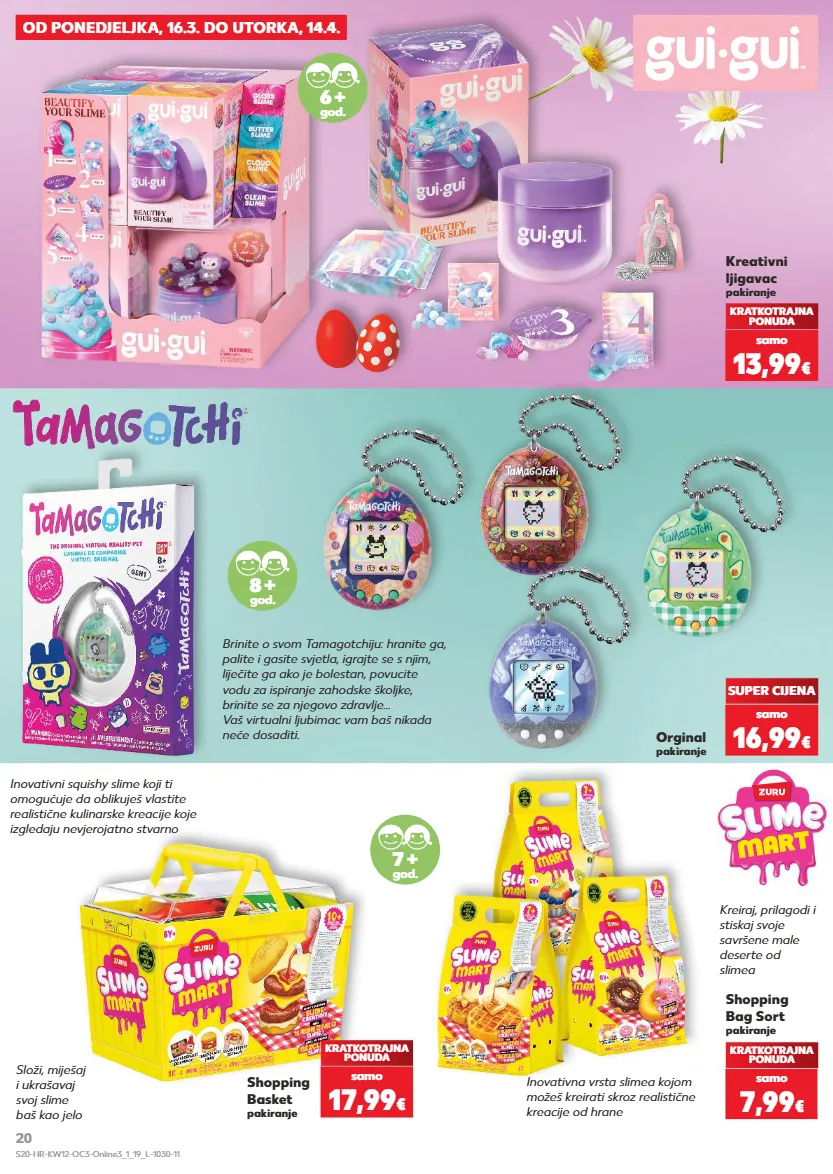 KRATKOTRAJNA PONUDA OD PONEDJELJKA, 16.3. DO UTORKA, 14.4. Kreativni ljigavac pakiranje Orginal pakiranje 6 + god. 8 + god. KRATKOTRAJNA PONUDA samo 13,99 € SUPER CIJENA samo 16,99 € Brinite o svom Tamagotchiju: hranite ga, palite i gasite svjetla, igrajte se s njim, liječite ga ako je bolestan, povucite vodu za ispiranje zahodske školjke, brinite se za njegovo zdravlje... Vaš virtualni ljubimac vam baš nikada neće dosaditi. Shopping Basket pakiranje KRATKOTRAJNA PONUDA samo 17,99 € Inovativni squishy slime koji ti omogućuje da oblikuješ vlastite realistične kulinarske kreacije koje izgledaju nevjerojatno stvarno Složi, miješaj i ukrašavaj svoj slime baš kao jelo Shopping Bag Sort pakiranje 7 + god. KRATKOTRAJNA PONUDA samo 7,99 € Kreiraj, prilagodi i stiskaj svoje savršene male deserte od slimea Inovativna vrsta slimea kojom možeš kreirati skroz realistične kreacije od hrane S20-HR-KW12-OC3-Online3_1_19_L-1030-11 20