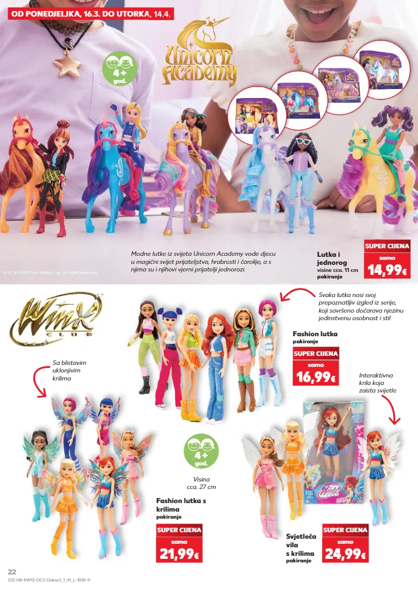 KRATKOTRAJNA PONUDA KRATKOTRAJNA PONUDA KRATKOTRAJNA PONUDA KRATKOTRAJNA PONUDA Modne lutke iz svijeta Unicorn Academy vode djecu u magični svijet prijateljstva, hrabrosti i čarolije, a s njima su i njihovi vjerni prijatelji jednorozi. OD PONEDJELJKA, 16.3. DO UTORKA, 14.4. 4 + god. SUPER CIJENA samo 14,99 € Lutka i jednorog visine cca. 11 cm pakiranje 4 + god. Visina cca. 27 cm Interaktivna krila koja zaista svijetle Sa blistavim uklonjivim krilima Svaka lutka nosi svoj prepoznatljiv izgled iz serije, koji savršeno dočarava njezinu jedinstvenu osobnost i stil SUPER CIJENA samo 21,99 € SUPER CIJENA samo 16,99 € SUPER CIJENA samo 24,99 € Fashion lutka s krilima pakiranje Fashion lutka pakiranje Svjetleća vila s krilima pakiranje OD PONEDJELJKA, 16.3. DO UTORKA, 14.4. S22-HR-KW12-OC3-Online3_1_41_L-1030-11 22