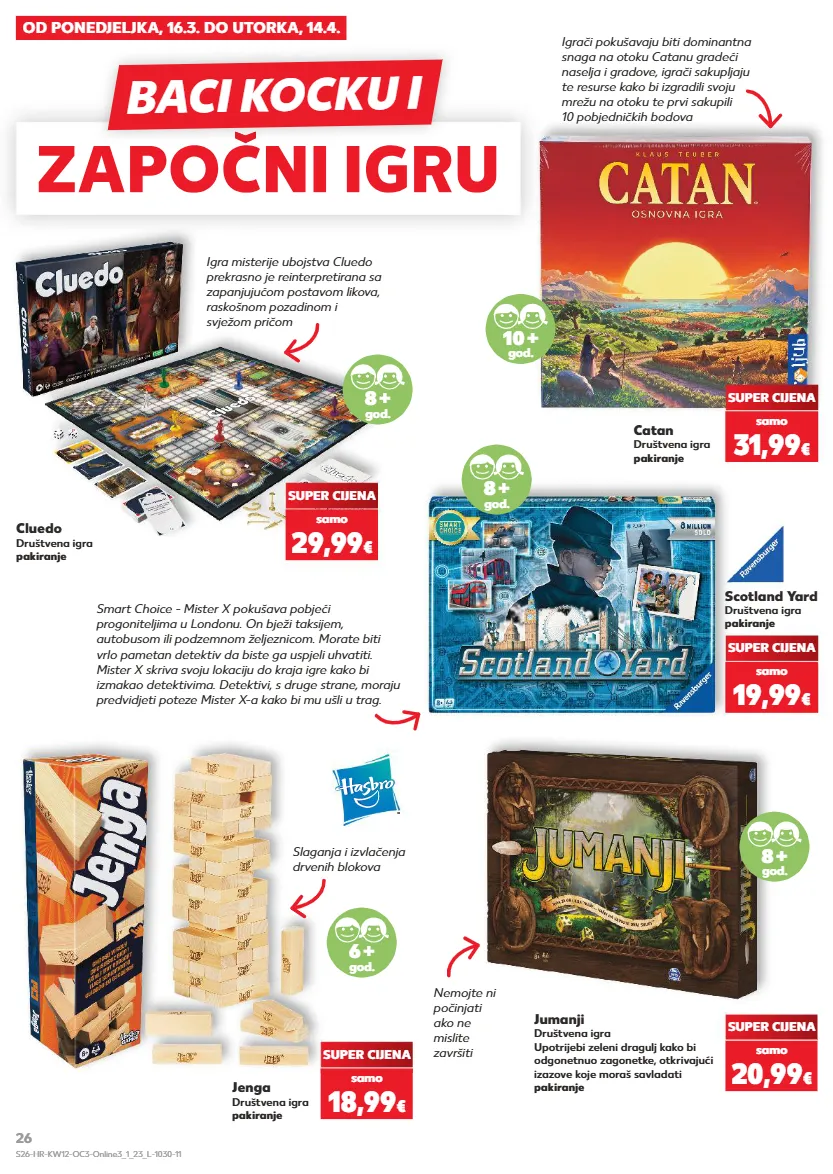 kratkotrajna ponuda kratkotrajna ponuda kratkotrajna ponuda kratkotrajna ponuda kratkotrajna ponuda od ponedjeljka, 16.3. do utorka, 14.4. cluedo društvena igra pakiranje catan društvena igra pakiranje jumanji društvena igra upotrijebi zeleni dragulj kako bi odgonetnuo zagonetke, otkrivajući izazove koje moraš savladati pakiranje scotland yard društvena igra pakiranje 10 + god. 8 + god. 8 + god. 6 + god. 8 + god. super cijena samo 29,99 € super cijena samo 31,99 € super cijena samo 19,99 € super cijena samo 20,99 € započni igru započni igru baci kocku i igrači pokušavaju biti dominantna snaga na otoku catanu gradeći naselja i gradove, igrači sakupljaju te resurse kako bi izgradili svoju mrežu na otoku te prvi sakupili 10 pobjedničkih bodova igra misterije ubojstva cluedo prekrasno je reinterpretirana sa zapanjujućom postavom likova, raskošnom pozadinom i svježom pričom smart choice - mister x pokušava pobjeći progoniteljima u londonu. on bježi taksijem, autobusom ili podzemnom željeznicom. morate biti vrlo pametan detektiv da biste ga uspjeli uhvatiti. mister x skriva svoju lokaciju do kraja igre kako bi izmakao detektivima. detektivi, s druge strane, moraju predvidjeti poteze mister x-a kako bi mu ušli u trag. nemojte ni počinjati ako ne mislite završiti jenga društvena igra pakiranje super cijena samo 18,99 € slaganja i izvlačenja drvenih blokova s26-hr-kw12-oc3-online3_1_23_l-1030-11 26