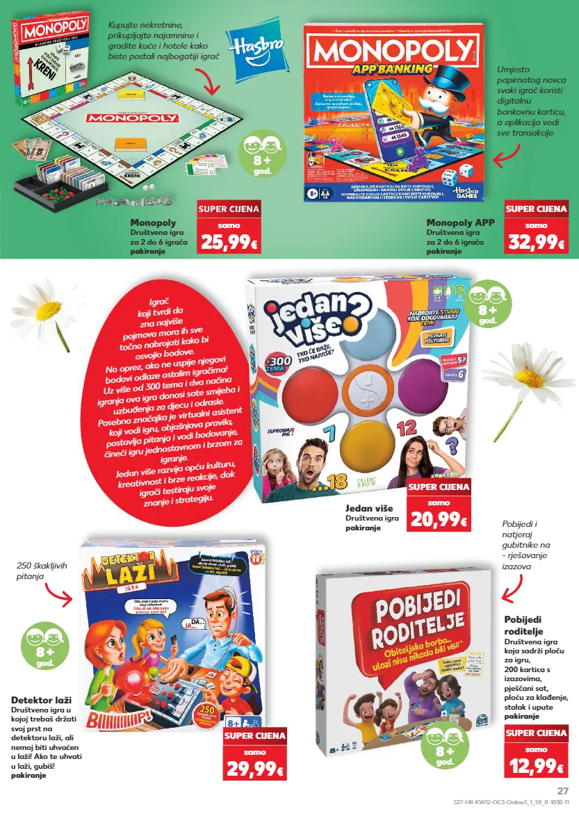 kratkotrajna ponuda kratkotrajna ponuda kratkotrajna ponuda kratkotrajna ponuda igrač koji tvrdi da zna najviše pojmova mora ih sve točno nabrojati kako bi osvojio bodove. no oprez, ako ne uspije njegovi bodovi odlaze ostalim igračima! uz više od 300 tema i dva načina igranja ova igra donosi sate smijeha i uzbuđenja za djecu i odrasle. posebna značajka je virtualni asistent koji vodi igru, objašnjava pravila, postavlja pitanja i vodi bodovanje, čineći igru jednostavnom i brzom za igranje. jedan više razvija opću kulturu, kreativnost i brze reakcije, dok igrači testiraju svoje znanje i strategiju. monopoly društvena igra za 2 do 6 igrača pakiranje jedan više društvena igra pakiranje detektor laži društvena igra u kojoj trebaš držati svoj prst na detektoru laži, ali nemoj biti uhvaćen u laži! ako te uhvati u laži, gubiš! pakiranje monopoly app društvena igra za 2 do 6 igrača pakiranje 8 + god. 8 + god. 8 + god. kratkotrajna ponuda super cijena samo 25,99 € super cijena samo 20,99 € super cijena samo 29,99 € super cijena samo 32,99 € pobijedi roditelje društvena igra koja sadrži ploču za igru, 200 kartica s izazovima, pješčani sat, ploću za klađenje, stalak i upute pakiranje 8 + god. super cijena samo 12,99 € 250 škakljivih pitanja umjesto papirnatog novca svaki igrač koristi digitalnu bankovnu karticu, a aplikacija vodi sve transakcije 8 god. super cijena kupujte nekretnine, prikupljajte najamnine i gradite kuće i hotele kako biste postali najbogatiji igrač pobijedi i natjeraj gubitnike na - rješavanje izazova s27-hr-kw12-oc3-online3_1_24_r-1030-11 27