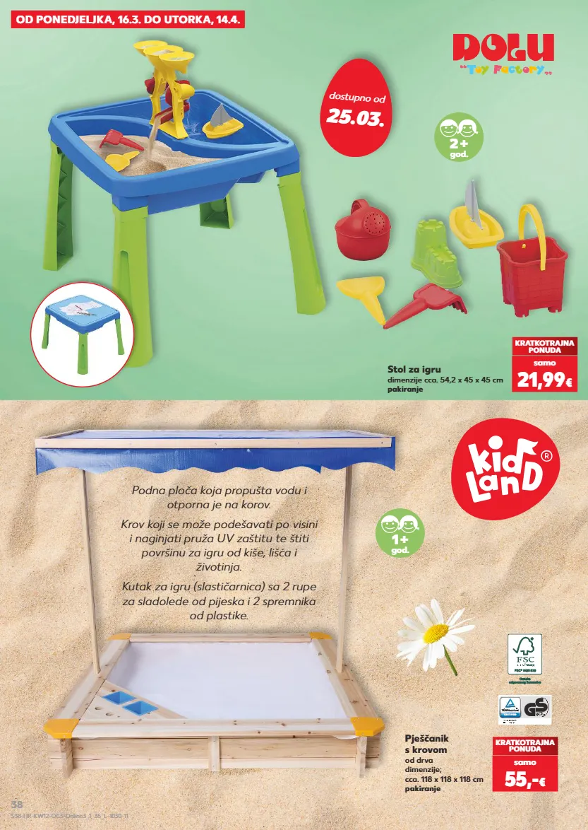dostupno od 25.03. od ponedjeljka, 16.3. do utorka, 14.4. kratkotrajna ponuda samo 21,99 € stol za igru dimenzije cca. 54,2 x 45 x 45 cm pakiranje 2 + god. kratkotrajna ponuda samo 55,- € pješčanik s krovom od drva dimenzije; cca. 118 x 118 x 118 cm pakiranje podna ploča koja propušta vodu i otporna je na korov. krov koji se može podešavati po visini i naginjati pruža uv zaštitu te štiti površinu za igru od kiše, lišća i životinja. kutak za igru (slastičarnica) sa 2 rupe za sladolede od pijeska i 2 spremnika od plastike. 1 + god. s38-hr-kw12-oc3-online3_1_35_l-1030-11 38