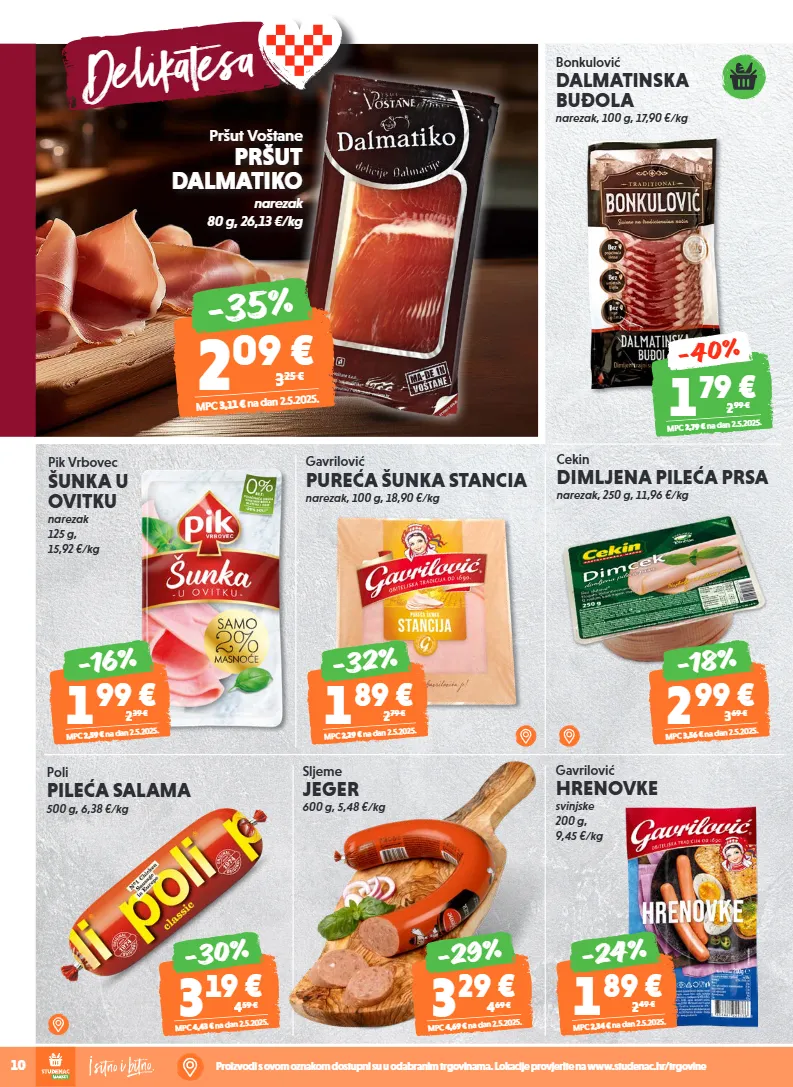 cekin dimljena pileća prsa narezak, 250 g, 11,96 €/kg gavrilović hrenovke svinjske 200 g, 9,45 €/kg -24% 1 89 € mpc 2,34 € na dan 2.5.2025. 2 4 9 € pik vrbovec šunka u ovitku narezak 125 g, 15,92 €/kg -16% 1 99 € mpc 2,59 € na dan 2.5.2025. 2 3 9 € gavrilović pureća šunka stancia narezak, 100 g, 18,90 €/kg -32% 1 89 € mpc 2,29 € na dan 2.5.2025. 2 7 9 € -18% 2 99 € mpc 3,56 € na dan 2.5.2025. 3 6 9 € 10 proizvodi s ovom oznakom dostupni su u odabranim trgovinama. lokacije provjerite na www.studenac.hr/trgovine bonkulović dalmatinska buđola narezak, 100 g, 17,90 €/kg -40% 1 79 € mpc 2,79 € na dan 2.5.2025. 2 9 9 € sljeme jeger 600 g, 5,48 €/kg -29% 3 29 € mpc 4,69 € na dan 2.5.2025. 4 6 9 € poli pileća salama 500 g, 6,38 €/kg -30% 3 19 € mpc 4,43 € na dan 2.5.2025. 4 5 9 € pršut voštane pršut dalmatiko narezak 80 g, 26,13 €/kg -35% 2 09 € mpc 3,11 € na dan 2.5.2025. 3 2 5 € delikatesa