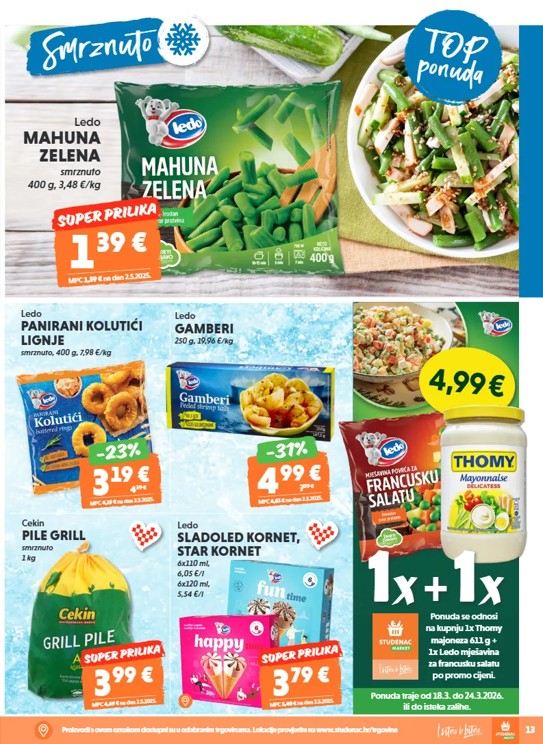 ledo mahuna zelena smrznuto 400 g, 3,48 €/kg 1 39 € mpc 1,59 € na dan 2.5.2025. super prilika ledo sladoled kornet, star kornet 6x110 ml, 6,05 €/l 6x120 ml, 5,54 €/l ledo gamberi 250 g, 19,96 €/kg ledo panirani kolutići lignje smrznuto, 400 g, 7,98 €/kg -23% 3 19 € mpc 4,19 € na dan 2.5.2025. 4 1 9 € smrznuto 13 proizvodi s ovom oznakom dostupni su u odabranim trgovinama. lokacije provjerite na www.studenac.hr/trgovine top top ponuda cekin pile grill smrznuto 1 kg -31% 4 99 € mpc 6,81 € na dan 2.5.2025. 7 2 9 € 3 79 € mpc 5,40 € na dan 2.5.2025. super prilika 3 99 € mpc 4,69 € na dan 2.5.2025. super prilika ponuda se odnosi na kupnju 1x thomy majoneza 611 g + 1x ledo mješavina za francusku salatu po promo cijeni. ponuda traje od 18.3. do 24.3.2026. ili do isteka zalihe. 1 x + 1 x 4,99 €