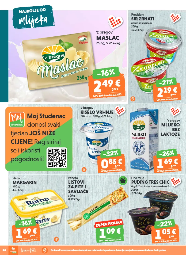 mlijeka najbolje od 3 3,2% m.m. 3 3,2% m.m. ‘z bregov kiselo vrhnje 12% m.m., 200 g, 4,25 €/kg -32% 0 85 € mpc 1,17 € na dan 2.5.2025. 1 2 5 € president sir zrnati natur, sa vlascem 200 g, 10,95 €/kg fino mi je puding tres chic dupla čokolada, tamna čokolada 200 g, 5,25 €/kg -22% 1 05 € mpc 1,35 € na dan 2.5.2025. 1 3 5 € -21% 2 19 € mpc 2,35 € na dan 2.5.2025. 2 7 9 € 14 proizvodi s ovom oznakom dostupni su u odabranim trgovinama. lokacije provjerite na www.studenac.hr/trgovine moj studenac donosi svaki tjedan još niže cijene! registriraj se i iskoristi pogodnosti! ‘z bregov mlijeko bez laktoze 1 l -26% 1 69 € mpc 2,15 € na dan 2.5.2025. 2 3 0 € ‘z bregov maslac 250 g, 9,96 €/kg -16% 2 49 € mpc 2,99 € na dan 2.5.2025. 2 7 9 € stanić margarin 400 g, 4,23 €/kg -16% 1 69 € mpc 2,02 € na dan 2.5.2025. 2 0 2 € panero listovi za pite i savijače 500 g 0,50 €/kg 1 09 € mpc 1,99 € na dan 2.5.2025. super prilika