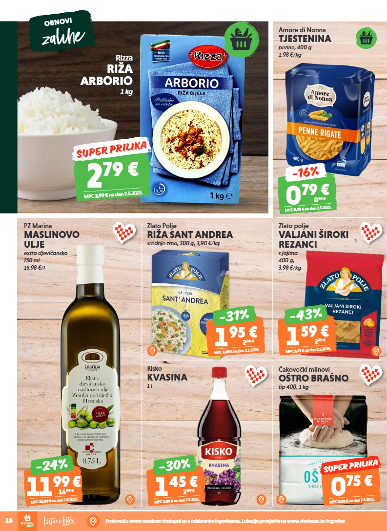 rizza riža arborio 1 kg pz marina maslinovo ulje extra djevičansko 750 ml 15,98 €/l -24% 11 99 € mpc 16,99 € na dan 2.5.2025. 1 6 9 9 € kisko kvasina 1 l -30% 1 45 € mpc 2,09 € na dan 2.5.2025. 2 0 9 € zlato polje valjani široki rezanci s jajima 400 g, 3,98 €/kg amore di nonna tjestenina penne, 400 g 1,98 €/kg -16% 0 79 € mpc 0,95 € na dan 2.5.2025. 0 9 5 € zlato polje riža sant andrea srednje zrno, 500 g, 3,90 €/kg -31% 1 95 € mpc 2,65 € na dan 2.5.2025. 2 8 6 € -43% 1 59 € mpc 2,79 € na dan 2.5.2025. 2 7 9 € čakovečki mlinovi oštro brašno tip 400, 1 kg 0 75 € mpc 0,83 € na dan 2.5.2025. super prilika 2 79 € mpc 2,99 € na dan 2.5.2025. super prilika zalihe obnovi 16 proizvodi s ovom oznakom dostupni su u odabranim trgovinama. lokacije provjerite na www.studenac.hr/trgovine