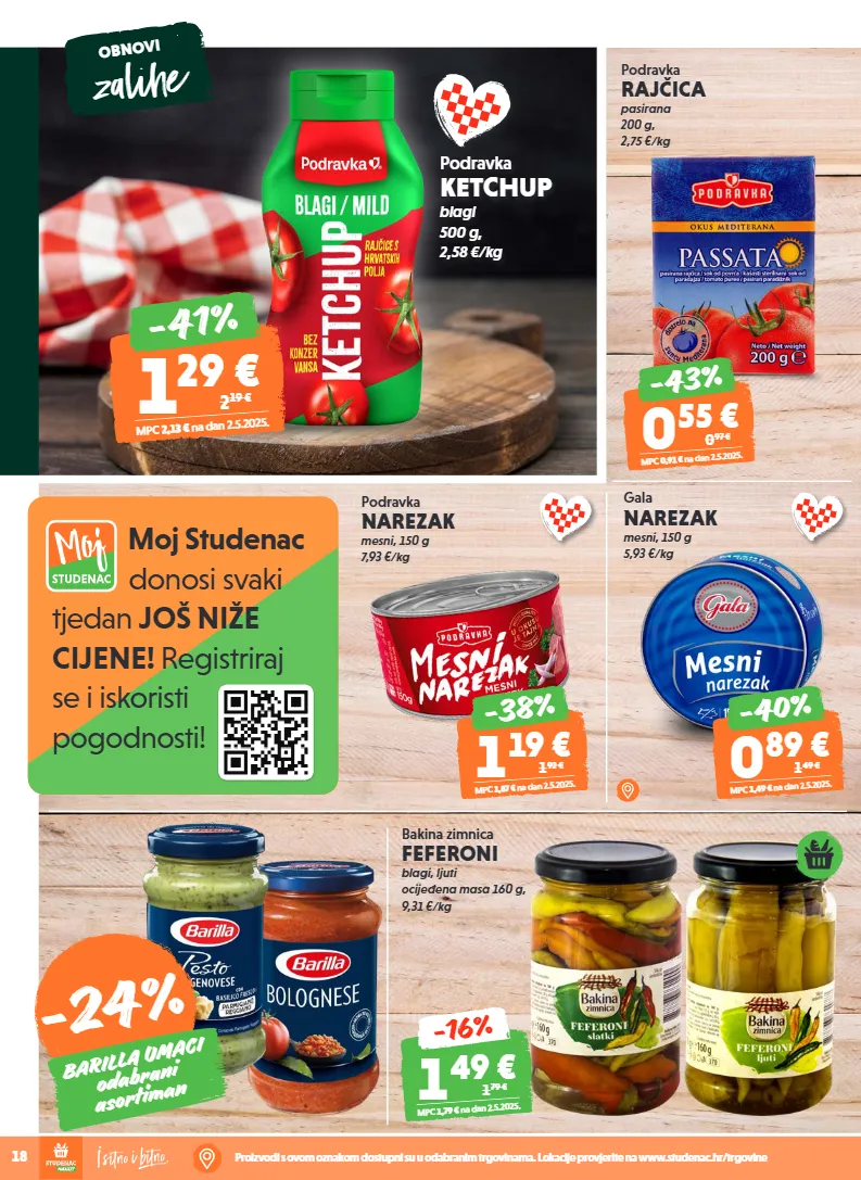 podravka rajčica pasirana 200 g, 2,75 €/kg -43% 0 55 € mpc 0,91 € na dan 2.5.2025. 0 9 7 € -24% barilla umaci odabrani asortiman bakina zimnica feferoni blagi, ljuti ocijeđena masa 160 g, 9,31 €/kg podravka narezak mesni, 150 g 7,93 €/kg -38% 1 19 € mpc 1,87 € na dan 2.5.2025. 1 9 2 € gala narezak mesni, 150 g 5,93 €/kg -40% 0 89 € mpc 1,49 € na dan 2.5.2025. 1 4 9 € podravka ketchup blagi 500 g, 2,58 €/kg -16% 1 49 € mpc 1,79 € na dan 2.5.2025. 1 7 9 € 18 proizvodi s ovom oznakom dostupni su u odabranim trgovinama. lokacije provjerite na www.studenac.hr/trgovine moj studenac donosi svaki tjedan još niže cijene! registriraj se i iskoristi pogodnosti! zalihe obnovi -41% 1 29 € mpc 2,13 € na dan 2.5.2025. 2 19 €