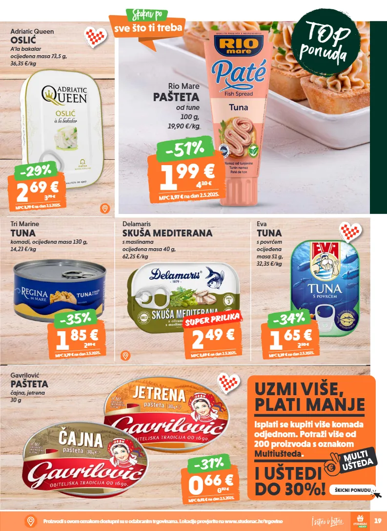 rio mare pašteta od tune 100 g, 19,90 €/kg eva tuna s povrćem ocijeđena masa 51 g, 32,35 €/kg -34% 1 65 € mpc 2,39 € na dan 2.5.2025. 2 5 0 € adriatic queen oslić a’la bakalar ocijeđena masa 73,5 g, 36,35 €/kg tri marine tuna komadi, ocijeđena masa 130 g, 14,23 €/kg -29% 2 69 € mpc 3,79 € na dan 2.5.2025. 3 7 9 € delamaris skuša mediterana s maslinama ocijeđena masa 40 g, 62,25 €/kg 2 49 € mpc 2,69 € na dan 2.5.2025. super prilika gavrilović pašteta čajna, jetrena 30 g -31% 0 66 € mpc 0,91 € na dan 2.5.2025. 0 9 7 € -35% 1 85 € mpc 2,79 € na dan 2.5.2025. 2 8 9 € skokni po sve što ti treba -51% 1 99 € mpc 3,97 € na dan 2.5.2025. 4 10 € top top ponuda 19 uzmi više, plati manje i uštedi do 30%! isplati se kupiti više komada odjednom. potraži više od 200 proizvoda s oznakom multiušteda . škicni ponudu proizvodi s ovom oznakom dostupni su u odabranim trgovinama. lokacije provjerite na www.studenac.hr/trgovine