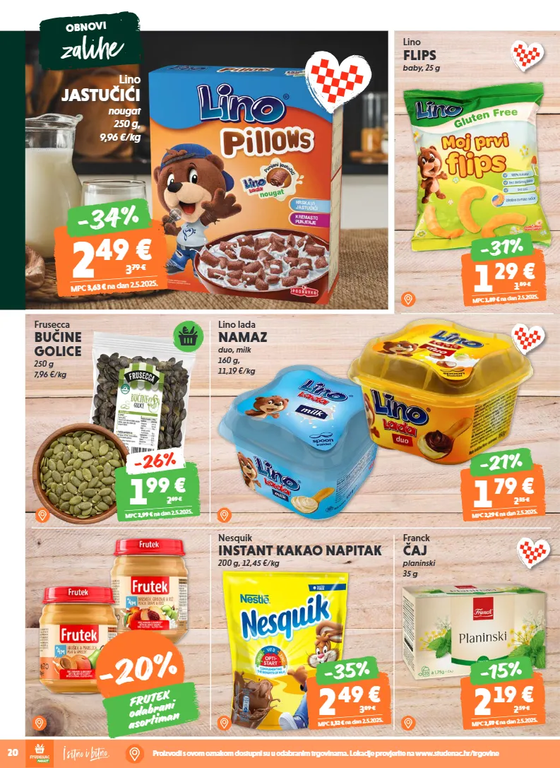 franck čaj planinski 35 g -15% 2 19 € mpc 2,59 € na dan 2.5.2025. 2 5 9 € lino lada namaz duo, milk 160 g, 11,19 €/kg -21% 1 79 € mpc 2,29 € na dan 2.5.2025. 2 3 5 € -20% frutek odabrani asortiman nesquik instant kakao napitak 200 g, 12,45 €/kg -35% 2 49 € mpc 3,32 € na dan 2.5.2025. 3 8 9 € frusecca bučine golice 250 g 7,96 €/kg -26% 1 99 € mpc 2,99 € na dan 2.5.2025. 2 69 € lino flips baby, 25 g -31% 1 29 € mpc 1,89 € na dan 2.5.2025. 1 8 9 € lino jastučići nougat 250 g, 9,96 €/kg -34% 2 49 € mpc 3,63 € na dan 2.5.2025. 3 79 € zalihe obnovi 20 proizvodi s ovom oznakom dostupni su u odabranim trgovinama. lokacije provjerite na www.studenac.hr/trgovine