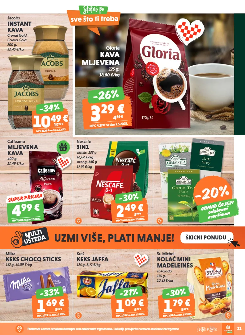 uzmi više, plati manje! škicni ponudu jacobs instant kava cronat gold, crema gold 200 g, 52,45 €/kg -34% 10 49 € mpc 12,79 € na dan 2.5.2025. 1 5 9 9 € caffeamo mljevena kava 400 g, 12,48 €/kg 4 99 € mpc 5,43 € na dan 2.5.2025. super prilika nescafe 3in1 classic, 155 g 16,06 €/kg strong, 140 g 17,79 €/kg -30% 2 49 € mpc 3,65 € na dan 2.5.2025. 3 5 8 € milka keks choco sticks 112 g, 15,09 €/kg -33% 1 69 € mpc 2,17 € na dan 2.5.2025. 2 5 5 € kraš keks jaffa 125 g, 8,72 €/kg -21% 1 09 € mpc 1,19 € na dan 2.5.2025. 1 3 9 € st. michel kolač mini madeleines čokolada 175 g, 10,23 €/kg -30% 1 79 € mpc 2,59 € na dan 2.5.2025. 2 6 9 € -20% ahmad čajevi odabrani asortiman gloria kava mljevena 175 g, 18,80 €/kg skokni po sve što ti treba -26% 3 29 € mpc 4,17 € na dan 2.5.2025. 4 45 € 21 proizvodi s ovom oznakom dostupni su u odabranim trgovinama. lokacije provjerite na www.studenac.hr/trgovine