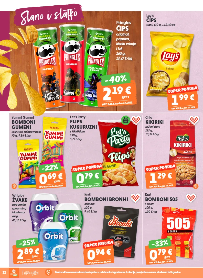 22 proizvodi s ovom oznakom dostupni su u odabranim trgovinama. lokacije provjerite na www.studenac.hr/trgovine kraš bomboni 505 s crtom 100 g, 7,90 €/kg -33% 0 79 € mpc 1,13 € na dan 2.5.2025. 1 1 9 € kraš bomboni bronhi original 100 g, 9,40 €/kg 0 94 € mpc 1,39 € na dan 2.5.2025. super prilika yummi gummi bomboni gumeni sour stick, rainbow belts 70 g, 9,86 €/kg -22% 0 69 € mpc 0,72 € na dan 23.7.2025. 0 8 9 € slano i slatko pringles čips original, paprika, kiselo vrhnje i luk 165 g, 13,27 €/kg -40% 2 19 € mpc 3,56 € na dan 2.5.2025. 3 6 9 € lay’s čips slani, 130 g, 15,31 €/kg 1 99 € mpc 2,39 € na dan 2.5.2025. super ponuda let’s party flips kukuruzni s kikirikijem 150 g, 5,27 €/kg 0 79 € mpc 0,82 € na dan 2.5.2025. super ponuda chio kikiriki prženi slani 125 g, 10,32 €/kg 1 29 € mpc 1,81 € na dan 2.5.2025. super ponuda wrigley žvake pepermint, spearmint, blueberry 64 g, 45,16 €/kg -25% 2 89 € mpc 3,97 € na dan 2.5.2025. 3 8 9 €