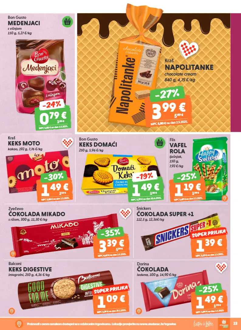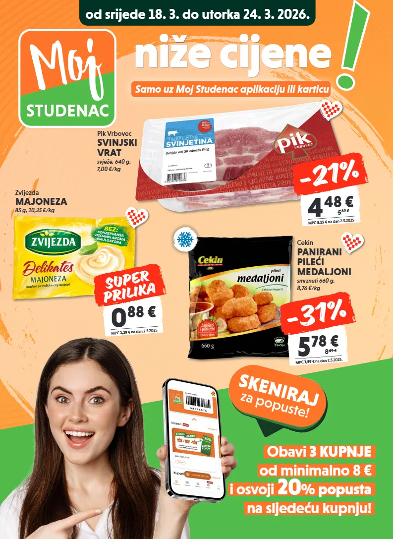s amo uz moj studenac aplikaciju ili karticu od srijede 18. 3. do utorka 24. 3. 2026. niže cijene obavi 3 kupnje od minimalno 8 € i osvoji 20 % popusta na sljedeću kupnju! zvijezda majoneza 85 g, 10,35 €/kg 0 , 88 € mpc 1,19 € na dan 2.5.2025. super prilika pik vrbovec svinjski vrat svježe, 640 g, 7,00 €/kg 4 , 48 € mpc 5,15 € na dan 2.5.2025. 5 , 6 9 € -21% cekin panirani pileći medaljoni smrznuti 660 g, 8,76 €/kg 5 , 78 € mpc 7,89 € na dan 2.5.2025. 8 , 4 9 € -31%