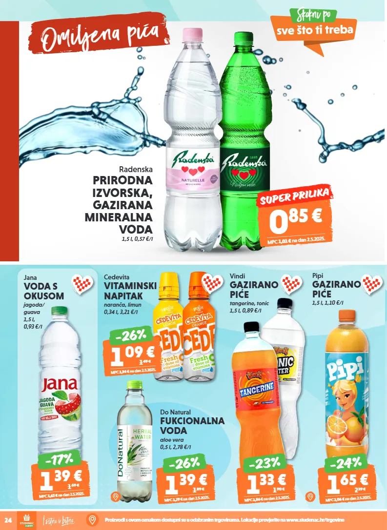 24 proizvodi s ovom oznakom dostupni su u odabranim trgovinama. lokacije provjerite na www.studenac.hr/trgovine skokni po sve što ti treba radenska prirodna izvorska, gazirana mineralna voda 1,5 l, 0,57 €/l jana voda s okusom jagoda/ guava 1,5 l, 0,93 €/l -17% 1 39 € mpc 1,62 € na dan 2.5.2025. 1 6 9 € omiljena pića vindi gazirano piće tangerine, tonic 1,5 l, 0,89 €/l do natural fukcionalna voda aloe vera 0,5 l, 2,78 €/l -26% 1 39 € mpc 1,79 € na dan 2.5.2025. 1 8 9 € -26% 1 09 € mpc 1,34 € na dan 2.5.2025. 1 4 9 € -23% 1 33 € mpc 1,86 € na dan 2.5.2025. 1 9 0 € 0 85 € mpc 1,01 € na dan 2.5.2025. super prilika cedevita vitaminski napitak naranča, limun 0,34 l, 3,21 €/l -24% 1 65 € mpc 2,06 € na dan 2.5.2025. 2 1 9 € pipi gazirano piće 1,5 l, 1,10 €/l