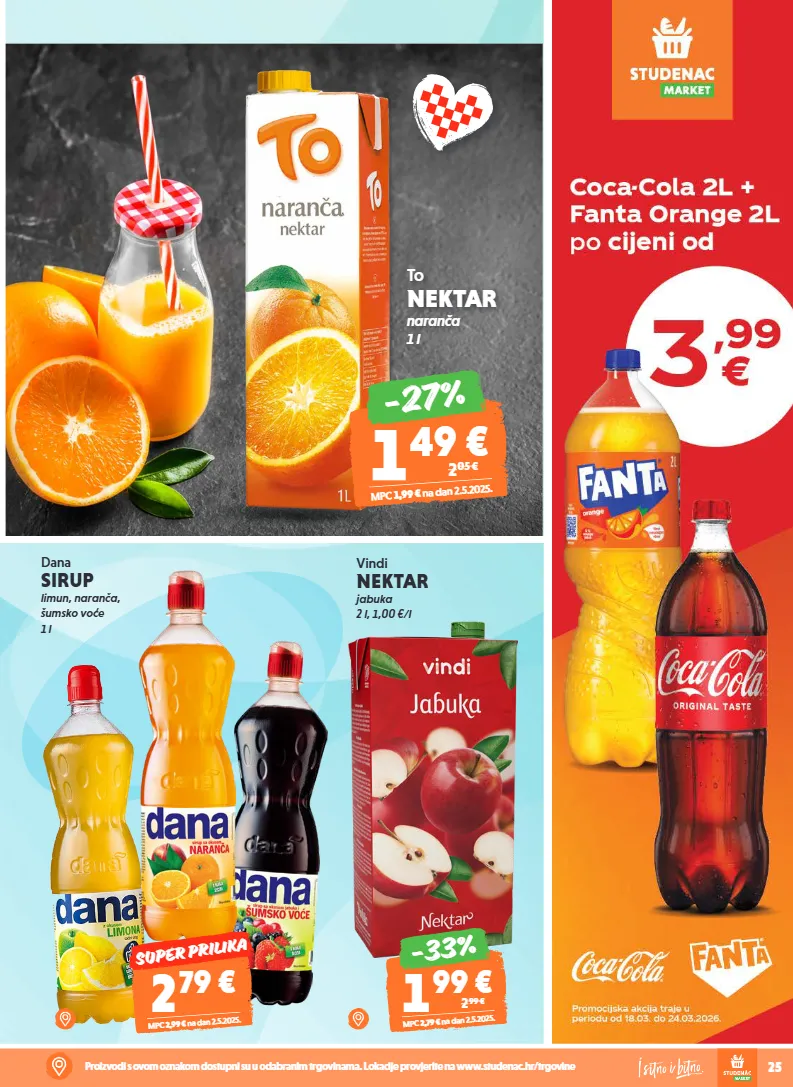 25 vindi nektar jabuka 2 l, 1,00 €/l -33% 1 99 € mpc 2,79 € na dan 2.5.2025. 2 9 9 € proizvodi s ovom oznakom dostupni su u odabranim trgovinama. lokacije provjerite na www.studenac.hr/trgovine top top ponuda to nektar naranča 1 l -27% 1 49 € mpc 1,99 € na dan 2.5.2025. 2 0 5 € dana sirup limun, naranča, šumsko voće 1 l 2 79 € mpc 2,99 € na dan 2.5.2025. super prilika