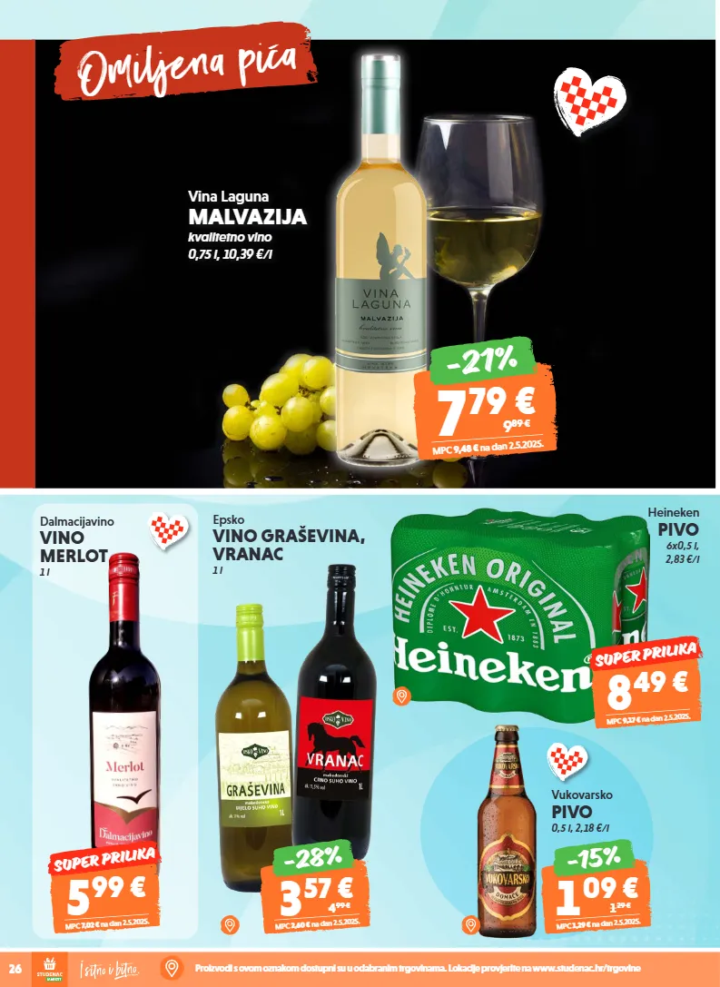 epsko vino graševina, vranac 1 l -28% 3 57 € mpc 2,60 € na dan 2.5.2025. 4 9 9 € 26 proizvodi s ovom oznakom dostupni su u odabranim trgovinama. lokacije provjerite na www.studenac.hr/trgovine vina laguna malvazija kvalitetno vino 0,75 l, 10,39 €/l -21% 7 79 € mpc 9,48 € na dan 2.5.2025. 9 8 9 € vukovarsko pivo 0,5 l, 2,18 €/l -15% 1 09 € mpc 1,29 € na dan 2.5.2025. 1 2 9 € omiljena pića dalmacijavino vino merlot 1 l 5 99 € mpc 7,02 € na dan 2.5.2025. super prilika heineken pivo 6x0,5 l, 2,83 €/l 8 49 € mpc 9,17 € na dan 2.5.2025. super prilika