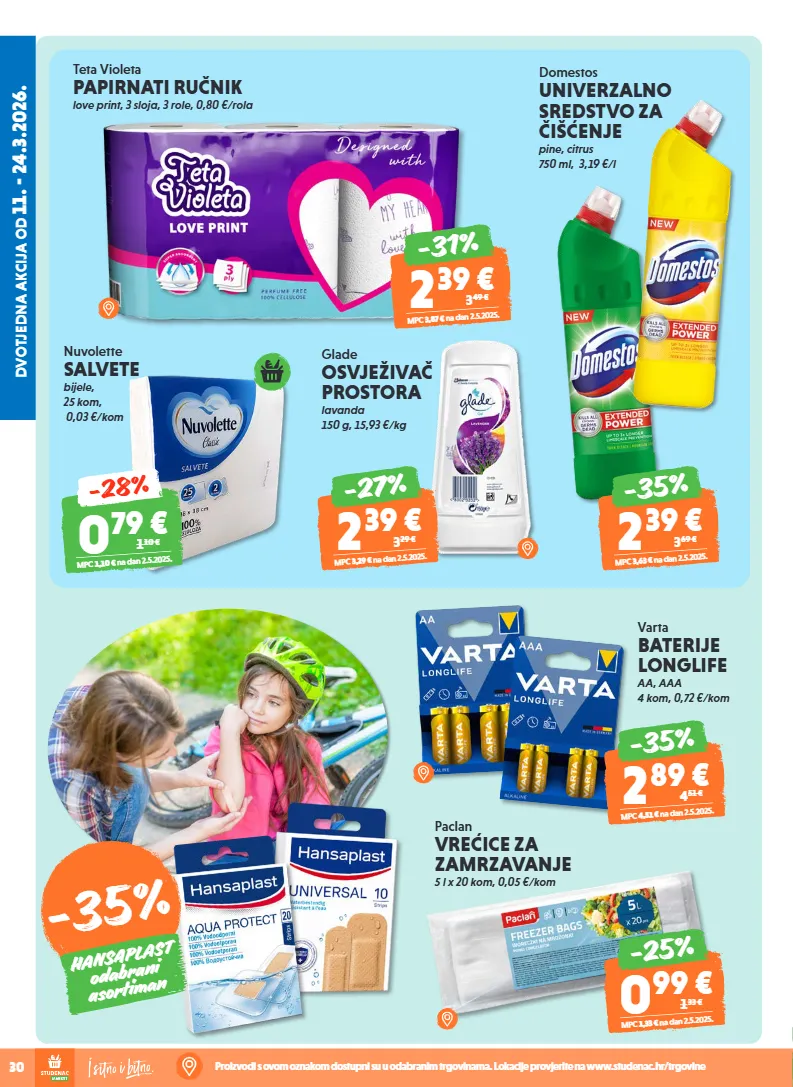 dvotjedna akcija od 11. - 24.3.2026. 38 30 proizvodi s ovom oznakom dostupni su u odabranim trgovinama. lokacije provjerite na www.studenac.hr/trgovine teta violeta papirnati ručnik love print, 3 sloja, 3 role, 0,80 €/rola -31% 2 39 € mpc 3,87 € na dan 2.5.2025. 3 4 9 € nuvolette salvete bijele, 25 kom, 0,03 €/kom -28% 0 79 € mpc 1,10 € na dan 2.5.2025. 1 1 0 € varta baterije longlife aa, aaa 4 kom, 0,72 €/kom paclan vrećice za zamrzavanje 5 l x 20 kom, 0,05 €/kom -35% 2 89 € mpc 4,51 € na dan 2.5.2025. 4 5 1 € -25% 0 99 € mpc 1,33 € na dan 2.5.2025. 1 3 3 € -35% hansaplast odabrani asortiman glade osvježivač prostora lavanda 150 g, 15,93 €/kg -27% 2 39 € mpc 3,29 € na dan 2.5.2025. 3 2 9 € domestos univerzalno sredstvo za čišćenje pine, citrus 750 ml, 3,19 €/l -35% 2 39 € mpc 3,63 € na dan 2.5.2025. 3 6 9 €