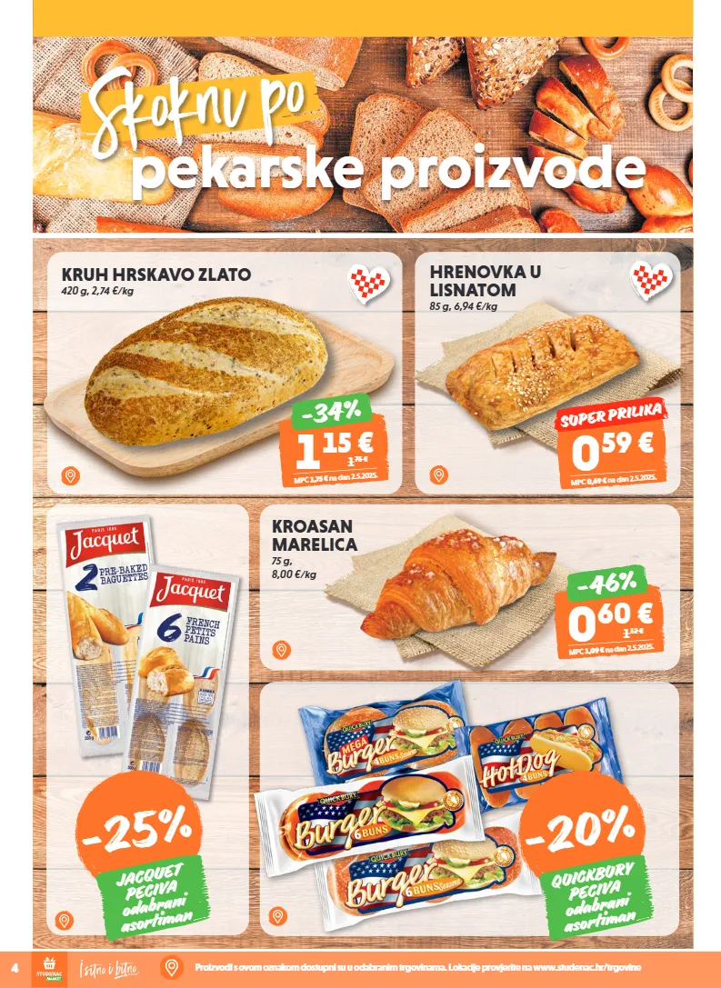 pekarske proizvode skokni po 4 proizvodi s ovom oznakom dostupni su u odabranim trgovinama. lokacije provjerite na www.studenac.hr/trgovine hrenovka u lisnatom 85 g, 6,94 €/kg 0 59 € mpc 0,69 € na dan 2.5.2025. super prilika kruh hrskavo zlato 420 g, 2,74 €/kg -34% 1 15 € mpc 1,75 € na dan 2.5.2025. 1 7 5 € kroasan marelica 75 g, 8,00 €/kg -46% 0 60 € mpc 1,09 € na dan 2.5.2025. 1 1 2 € -20% quickbury peciva odabrani asortiman -25% jacquet peciva odabrani asortiman