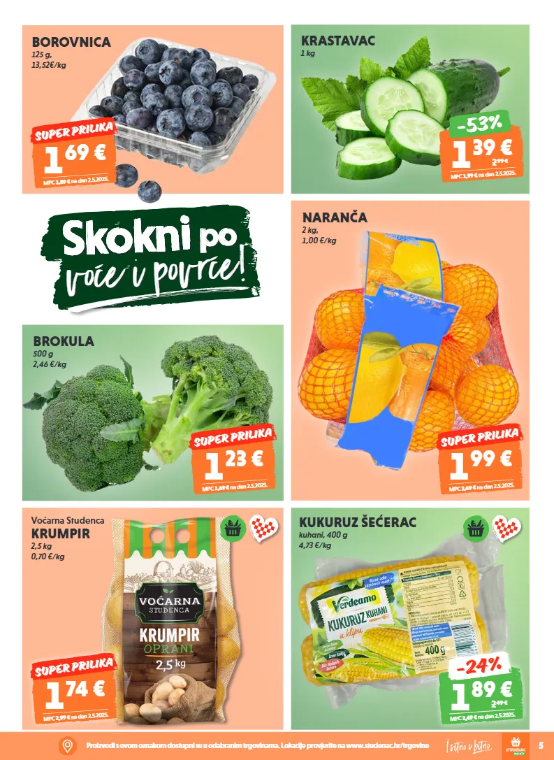 po skokni voće i povrće! 5 proizvodi s ovom oznakom dostupni su u odabranim trgovinama. lokacije provjerite na www.studenac.hr/trgovine borovnica 125 g, 13,52€/kg naranča 2 kg, 1,00 €/kg krastavac 1 kg -53% 1 39 € mpc 1,99 € na dan 2.5.2025. 2 9 9 € 1 69 € mpc 1,89 € na dan 2.5.2025. super prilika brokula 500 g 2,46 €/kg 1 23 € mpc 1,69 € na dan 2.5.2025. super prilika kukuruz šećerac kuhani, 400 g 4,73 €/kg -24% 1 89 € mpc 2,49 € na dan 2.5.2025. 2 4 9 € voćarna studenca krumpir 2,5 kg 0,70 €/kg 1 74 € mpc 2,99 € na dan 2.5.2025. super prilika 1 99 € mpc 2,69 € na dan 2.5.2025. super prilika