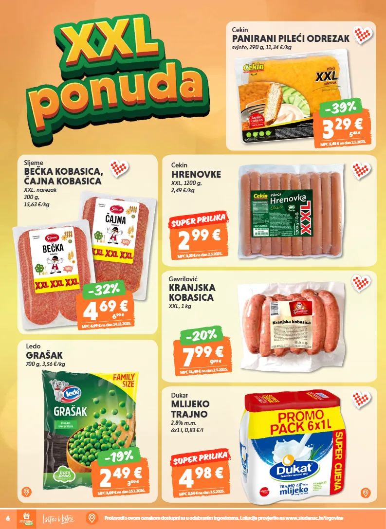 cekin panirani pileći odrezak svježe, 290 g, 11,34 €/kg -39% 3 29 € mpc 5,45 € na dan 2.5.2025. 5 4 5 € gavrilović kranjska kobasica xxl, 1 kg -20% 7 99 € mpc 11,49 € na dan 2.5.2025. 9 9 9 € sljeme bečka kobasica, čajna kobasica xxl , narezak 300 g, 15,63 €/kg cekin hrenovke xxl , 1200 g, 2,49 €/kg 2 99 € mpc 3,22 € na dan 2.5.2025. super prilika dukat mlijeko trajno 2,8% m.m. 6x1 l, 0,83 €/l 4 98 € mpc 5,54 € na dan 2.5.2025. super prilika -32% 4 69 € mpc 6,99 € na dan 14.11.2025. 6 9 9 € 6 proizvodi s ovom oznakom dostupni su u odabranim trgovinama. lokacije provjerite na www.studenac.hr/trgovine ledo grašak 700 g, 3,56 €/kg -19% 2 49 € mpc 3,09 € na dan 15.1.2026. 3 0 9 €