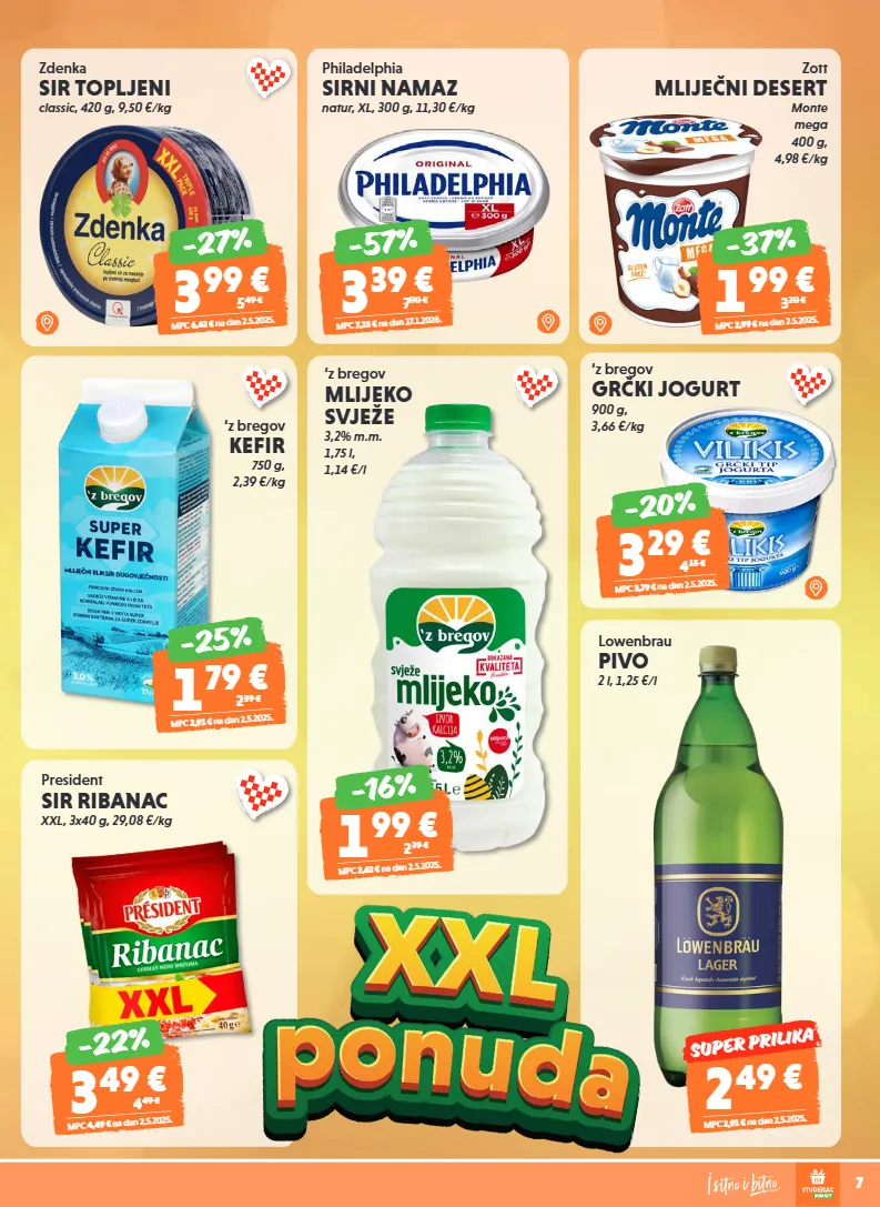 zdenka sir topljeni classic, 420 g, 9,50 €/kg -27% 3 99 € mpc 6,62 € na dan 2.5.2025. 5 4 9 € ‘z bregov kefir 750 g, 2,39 €/kg -25% 1 79 € mpc 2,91 € na dan 2.5.2025. 2 3 9 € philadelphia sirni namaz natur, xl, 300 g, 11,30 €/kg -57% 3 39 € mpc 7,15 € na dan 17.1.2026. 7 0 0 € zott mliječni desert monte mega 400 g, 4,98 €/kg -37% 1 99 € mpc 2,99 € na dan 2.5.2025. 3 2 0 € lowenbrau pivo 2 l, 1,25 €/l president sir ribanac xxl, 3x40 g, 29,08 €/kg -22% 3 49 € mpc 4,49 € na dan 2.5.2025. 4 4 9 € ‘z bregov mlijeko svježe 3,2% m.m. 1,75 l, 1,14 €/l -16% 1 99 € mpc 2,62 € na dan 2.5.2025. 2 3 9 € ‘z bregov grčki jogurt 900 g, 3,66 €/kg -20% 3 29 € mpc 3,79 € na dan 2.5.2025. 4 1 5 € 7 2 49 € mpc 2,91 € na dan 2.5.2025. super prilika