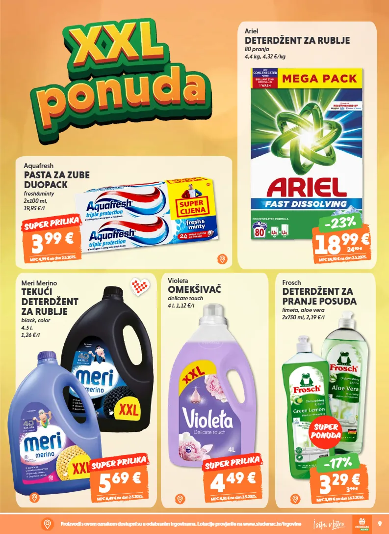 ariel deterdžent za rublje 80 pranja 4,4 kg, 4,32 €/kg -23% 18 99 € mpc 24,92 € na dan 2.5.2025. 2 4 9 2 € aquafresh pasta za zube duopack fresh&minty 2x100 ml, 19,95 €/l 3 99 € mpc 4,99 € na dan 2.5.2025. super prilika meri merino tekući deterdžent za rublje black, color 4,5 l, 1,26 €/l 5 69 € mpc 6,49 € na dan 2.5.2025. super prilika violeta omekšivač delicate touch 4 l, 1,12 €/l frosch deterdžent za pranje posuđa limeta, aloe vera 2x750 ml, 2,19 €/l -17% 3 29 € mpc 3,99 € na dan 16.2.2026. 3 9 9 € super ponuda 4 49 € mpc 4,51 € na dan 2.5.2025. super prilika 9 proizvodi s ovom oznakom dostupni su u odabranim trgovinama. lokacije provjerite na www.studenac.hr/trgovine
