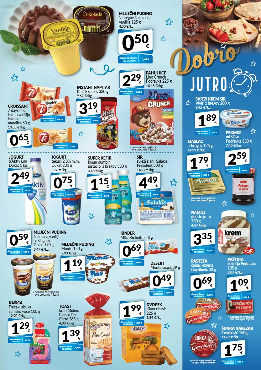 dobro jutro 0 50 € mliječni puding ‘z bregov čokolada, vanilija 125 g 4,00 €/kg cijena na datum 02.05.2025. 0,74 € namaz duo to je to 750 g 4,47 €/kg 3 35 € cijena na datum 02.05.2025. 3,99 € pašteta čajna, jetrena gavrilović 30 g 0 69 € cijena na datum 02.05.2025. 0,89 € svježi krem sir vivis ‘z bregov 200 g 9,45 €/kg 1 89 € cijena na datum 02.05.2025. 2,59 € pekmez od šljiva podravka 350 g 7,40 €/kg 2 59 € cijena na datum 02.05.2025. 3,39 € sir svježi slani salakis prèsident 300 g 14,97 €/kg 4 49 € cijena na datum 02.05.2025. 5,39 € kinder milch-schnitte 28 g 0 69 € cijena na datum 02.05.2025. 0,85 € desert monte snack 29 g 0 49 € cijena na datum 02.05.2025. 0,60 € jogurt tekući 2,8% m.m. dukat 230 g 3,26 €/kg 0 75 € cijena na datum 02.05.2025. 0,90 € mliječni puding čokolada,vanilija sa šlagom dolce 170 g 3,47 €/kg 0 59 € cijena na datum 02.05.2025. 0,80 € mliječni puding monte 150 g 7,93 €/kg 1 19 € cijena na datum 02.05.2025. 1,44 € dvopek klara classic 225 g 8,84 €/kg 1 99 € cijena na datum 02.05.2025. 2,89 € toast kruh mulino bianco pan carrè 285 g 4,88 €/kg 1 39 € cijena na datum 02.05.2025. 1,64 € kašica frutek jabuka šumsko voće 100 g 12,90 €/kg 1 29 € cijena na datum 02.05.2025. 1,75 € jogurt b’aktiv lgg dukat 1 kg 2 49 € cijena na datum 02.05.2025. 2,99 € * ponuda ne vrijedi za sva prodajna mjesta maslac ‘z bregov 125 g 14,32 €/kg 1 79 € cijena na datum 02.05.2025. 2,39 € * ponuda ne vrijedi za sva prodajna mjesta šunka narezak gavrilović 150 g 11,67 €/kg 1 75 € cijena na datum 02.05.2025. 2,39 € * ponuda ne vrijedi za sva prodajna mjesta super kefir limun đumbir, pistacio ‘z bregov 330 g 3,48 €/kg 1 15 € cijena na datum 02.05.2025. 1,95 € pahuljice lino crunch podravka 225 g 10,18 €/kg 2 29 € cijena na datum 02.05.2025. 3,23 € * ponuda ne vrijedi za sva prodajna mjesta instant napitak kraš express 330 g 9,67 €/kg 3 19 € cijena na datum 02.05.2025. 4,29 € croissant 7 days midi kakao vanilija, kakao, marelica 60 g 10,83 €/kg 0 65 € pašteta kokošja podravka 135 g 8,07 €/kg 1 09 € cijena na datum 02.05.2025. 1,56 € * ponuda ne vrijedi za sva prodajna mjesta cijena na datum 02.05.2025. 0,93 € cijena na datum 01.06.2025. 0,99 € ntl robna marka