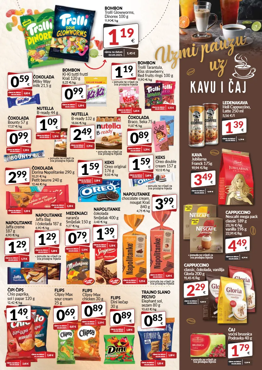 kavu i čaj uzmi pauzu uz 1 39 € ledenakava hell cappuccino, latte 250 ml 5,56 €/l cijena na datum 02.05.2025. 1,79 € 3 49 € kava jubilarna franck 175g 19,94 €/kg cijena na datum 02.05.2025. 4,49 € 4 49 € cappuccino nescafé mega pack classic 189 g 23,76 €/kg vanilla 196 g 22,91 €/kg cijena na datum 02.05.2025. 6,79 € * ponuda ne vrijedi za sva prodajna mjesta 1 39 € napolitanke čokolada smiješak 400 g 3,48 €/kg cijena na datum 02.05.2025. 1,59 € 3 99 € napolitanke chocolate cream, nougat kraš 840 g 4,75 €/kg 0 79 € medenjaci naranča smiješak 150 g 5,27 €/kg cijena na datum 02.05.2025. 1,19 € 0 89 € čokolada braco, seka 75 g 11,87 €/kg cijena na datum 02.05.2025. 1,29 € 0 99 € bombon ki-ki tutti frutti kraš 120 g 8,25 €/kg cijena na datum 26.01.2026. 1,39 € 0 99 € čokolada bounty 57 g 17,37 €/kg cijena na datum 02.05.2025. 1,59 € 0 59 € čokolada milky way milk 21,5 g cijena na datum 02.05.2025. 0,85 € 2 99 € čokolada dorina napolitanke 290 g 10,31 €/kg petit beurre 240 g 12,46 €/kg 1 29 € napolitanke jaffa creme 187 g 6,90 €/kg cijena na datum 02.05.2025. 1,75 € 1 49 € čipi čips chio paprika, sol i papar 120 g 12,42 €/kg 0 85 € trajno slano pecivo elephant sol, sezam 80 g 10,63 €/kg cijena na datum 02.05.2025. 2,45 € cijena na datum 02.05.2025. 1,05 € cijena na datum 02.05.2025. 1,09 € cijena na datum 31.10.2025. 2,49 € 0 69 € flips clipsy max sour cream 25 g cijena na datum 02.05.2025. 0,87 € 0 89 € flips clipsy max chicken 30 g cijena na datum 02.05.2025. 1,19 € 0 89 € flips dini kečap 30 g cijena na datum 02.05.2025. 1,09 € 1 79 € čaj voćni brusnica podravka 40 g cijena na datum 02.05.2025. 2,19 € * ponuda ne vrijedi za sva prodajna mjesta 1 29 € napolitanke jaffa šlag i čokolada 187 g 6,90 €/kg cijena na datum 02.05.2025. 1,69 € * ponuda ne vrijedi za sva prodajna mjesta 1 19 € bombon trolli glowworms, dinorex 100 g 11,90€/kg cijena na datum 02.05.2025. 1,45 € cijena na datum 02.05.2025. 5,39 € cijena na datum 02.05.2025. 5,59 € cijena na datum 02.05.2025. 5,25 € cijena na datum 02.05.2025. 5,39 € * ponuda ne vrijedi za sva prodajna mjesta 1 59 € keks oreo double cream 157 g 10,13 €/kg cijena na datum 02.05.2025. 2,69 € * ponuda ne vrijedi za sva prodajna mjesta cijena na datum 02.05.2025. 1,45 € cijena na datum 23.09.2025. 1,55 € 1 19 € bombon trolli tarantula, kiss strawberry, red fruits rings 100 g 11,90 €/kg * ponuda ne vrijedi za sva prodajna mjesta 2 49 € nutella b-ready 132 g 18,86 €/kg cijena na datum 02.05.2025. 2,79 € * ponuda ne vrijedi za sva prodajna mjesta 1 09 € nutella b-ready 44 g cijena na datum 02.05.2025. 1,29 € * ponuda ne vrijedi za sva prodajna mjesta 2 29 € cappuccino classic, čokolada, vanilija gloria 200 g 11,45 €/kg cijena na datum 02.05.2025. 3,09 € 1 59 € keks oreo original 176 g 9,03 €/kg cijena na datum 02.05.2025. 2,39 € ntl robna marka ntl robna marka