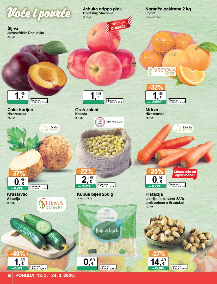 pistacija podrijetlo sirovine: sad; proizvedeno u hrvatskoj (€ / kg) cijena na 2.5.2025:19,99 € -27% 19,99 € 14 , 49 € kupus bijeli 250 g (1 kg=2,76 €) cijena na 2.5.2025: 0,99 € 0 , 69 € šljiva južnoafrička republika (€ / kg) cijena na 2.5.2025: 3,99 € 1 , 49 € jabuka cripps pink hrvatska; slavonija (€ / kg) cijena na 2.5.2025: 1,49 € 1 , 39 € krastavac albanija (€ / kg) cijena na 2.5.2025: 1,29 € -48% 2,69 € 1 , 39 € naranča pakirana 2 kg egipat (1 kg=0,84 €) cijena na 2.5.2025: 2,49 € -32% 2,49 € 1 , 68 € grah zeleni kanada (€ / kg) cijena na 2.5.2025: 3,85 € -22% 3,85 € 2 , 99 € mrkva nizozemska (€ / kg) cijena na 2.5.2025: 0,89 € -25% 0,79 € 0 , 59 € celer korijen nizozemska (€ / kg) cijena na 2.5.2025: 1,29 € -37% 0,79 € 0 , 49 € cijena niža od ograničene! ponuda 18. 3. - 24. 3. 2026. 10 voće i povrće