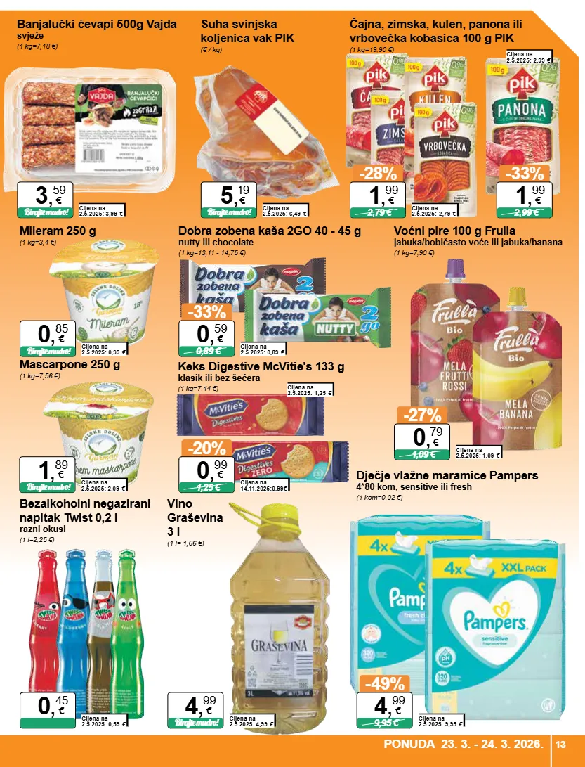 banjalučki ćevapi 500g vajda svježe (1 kg=7,18 €) cijena na 2.5.2025: 3,99 € birajte mudro! 3 , 59 € čajna, zimska, kulen, panona ili vrbovečka kobasica 100 g pik (1 kg=19,90 €) cijena na 2.5.2025: 2,79 € -28% 2,79 € 1 , 99 € cijena na 2.5.2025: 2,99 € -33% 2,99 € 1 , 99 € suha svinjska koljenica vak pik (€ / kg) cijena na 2.5.2025: 6,49 € birajte mudro! 5 , 19 € mileram 250 g (1 kg=3,4 €) cijena na 2.5.2025: 0,99 € birajte mudro! 0 , 85 € mascarpone 250 g (1 kg=7,56 €) cijena na 2.5.2025: 2,09 € birajte mudro! 1 , 89 € bezalkoholni negazirani napitak twist 0,2 l razni okusi (1 l=2,25 €) cijena na 2.5.2025: 0,59 € 0 , 45 € vino graševina 3 l (1 l= 1,66 €) cijena na 2.5.2025: 4,99 € birajte mudro! 4 , 99 € dječje vlažne maramice pampers 4*80 kom, sensitive ili fresh (1 kom=0,02 €) cijena na 2.5.2025: 9,95 € -49% 9,95 € 4 , 99 € dobra zobena kaša 2go 40 - 45 g nutty ili chocolate (1 kg=13,11 - 14,75 €) cijena na 2.5.2025: 0,89 € -33% 0,89 € 0 , 59 € cijena na 14.11.2025:0,99 € -20% 1,25 € 0 , 99 € cijena na 2.5.2025: 1,25 € voćni pire 100 g frulla jabuka/bobičasto voće ili jabuka/banana (1 kg=7,90 €) cijena na 2.5.2025: 1,09 € -27% 1,09 € 0 , 79 € keks digestive mcvitie's 133 g klasik ili bez šećera (1 kg=7,44 €) 13 ponuda 23. 3. - 24. 3. 2026.
