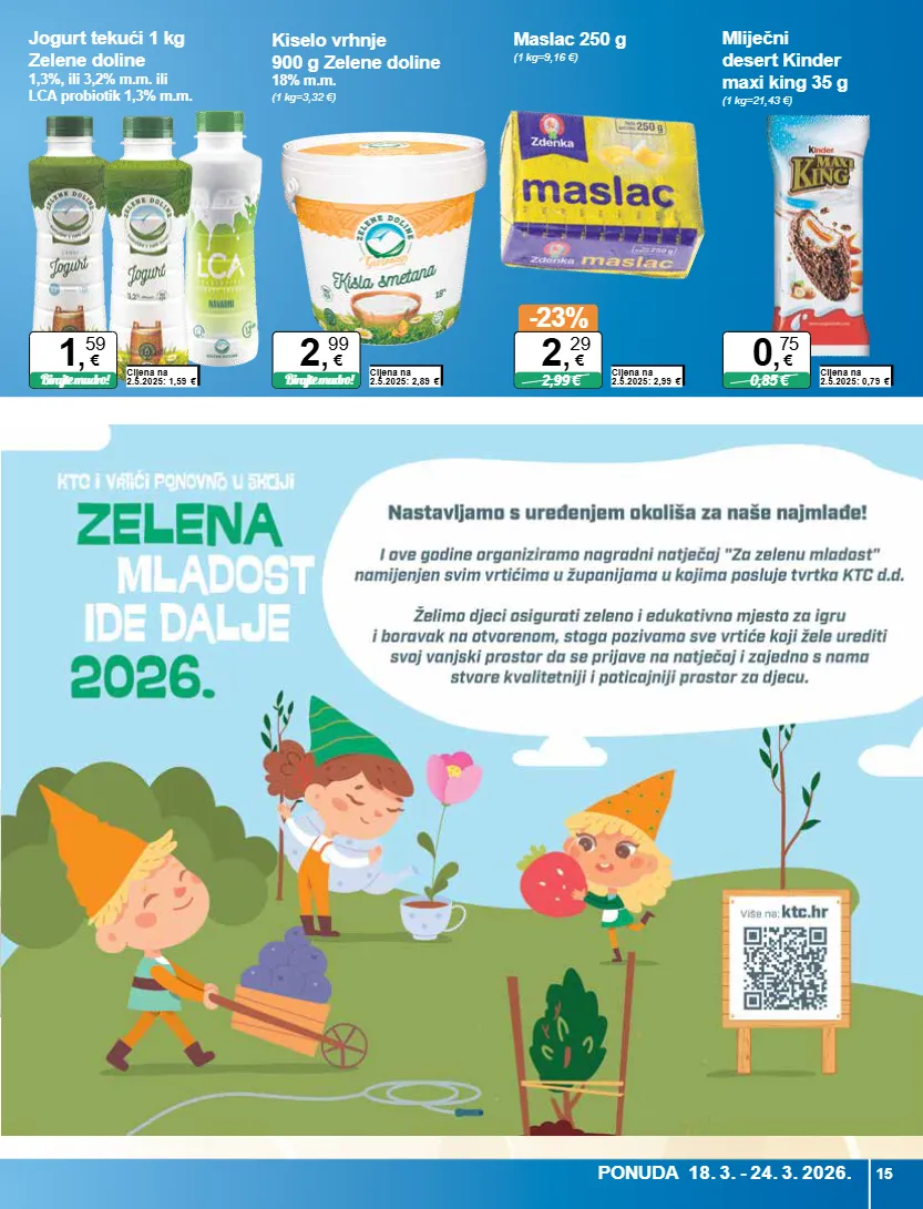 nakladnik: ktc d.d., n, tesle 18, 48260 križevci, tel: 048/628-554 u nekim prodajnim prostorima, zbog ograničenog prostora, nisu dostupni svi proizvodi iz letka . ktc d.d. zadržava pravo promjene cijena uslijed promjena cijena na tržištu | sve fotografije proizvoda su simbolične, te ne moraju odgovarati stvarnom proizvodu | ktc d.d. zadržava pravo tiskarske pogreške robni centri: bjelovar-50 , pakračka ulica 1, 043/638-871, čakovec-64 , športska 4, 040/638-271, daruvar-78 , krste frankopana 35, 043/638-380, đurđevac-59 , đure basaričeka 16, 048/628-080 grubišno polje-76 , ulica n. š. zrinskog bb, 043/639-170, ivanec-58, ivanečko naselje 1c, 042/771-870, karlovac-8a, senjska 118, 047/658-100, koprivnica-40, i. česmičkog 15, 048/628-330, koprivnica-88, trg eugena kumičića 1, 048/617-640, krapina-77, bobovje 52/c, 049/658-100, križevci-95, n. tesle 18–048/628-595, kutina-54, sisačka ulica 14, 044/660-871, mursko središće-86, tekstilna ulica 1, 040/644-230, pakrac-69, i. gundulića 1b, 034/638-970, petrinja-79, ul. ivana gundulića 14, 044/500-551, pitomača-42, p. preradovića 2, 033/638-902, požega-44, p. radića 46a, 034/638-152, prelog-62, zrinskih bb, 040/638-160, sisak-41, n. tesle 12/b, 044/660-926, slatina-43, industrijska bb, 033/638-021, varaždin-87, gospodarska 3, 042/658-850, virovitica-46, vukovarska 3a, 033/638-970, vrbovec-48, zagrebačka 48, 01/2793-242, zabok-60, prilaz janka tomića 1, 049/658-966, dugo selo-90, ii savski odvojak 12,01/688-6230 cijene u letku su informativne naravi te se može pojaviti odstupanje na pojedinim prodajnim mjestima. točna cijena objavljena je na prodajnom mjestu uz svaki proizvod. cijena niža od ograničene! svježe mlijeko 1,5 l (1 l=1,26 €) cijena na 2.5.2025: 2,08 € birajte mudro! 1 , 89 € trajno mlijeko 2 l vindija 2,8% m.m. (1 l=0,87 €) cijena na 2.5.2025: 2,04 € 1 , 74 € jogurt tekući 1 kg 2,8% m.m. cijena na 2.5.2025: 2,22 € -20% 2,49 € 1 , 99 € trajno mlijeko 1 l cijena na 2.5.2025: 1,02 € birajte mudro! 0 , 79 € cijena niža od ograničene! sir toast 150 g president gouda, cheddar ili emmentaler (1 kg=11,27 €) cijena na 2.5.2025: 1,79 € 1,99 € 1 , 69 € mliječni desert choco loco 4x125 g (1 kg=3,38 €) cijena na 2.5.2025: 1,85 € 1,99 € 1 , 69 € polutvrdi kravlji sir 200g cheddar, dimek, gauda ili tilzit (1 kg=8,63 €) cijena na 2.5.2025: 3,49- 3,89 € 3,49-3,89 € 2 , 59 € polutvrdi sir gauda zelene doline rfs (€ / kg) cijena na 2.5.2025: 6,39 € birajte mudro! 4 , 99 € mliječni desert monte 400 g (1 kg=4,97 €) cijena na 2.5.2025: 2,39 € birajte mudro! 1 , 99 € svježi sir 1 kg cijena na 2.5.2025: 4,49 € birajte mudro! 3 , 59 € 14 mlijeko i mliječni proizvodi ponuda 18. 3. - 24. 3. 2026.