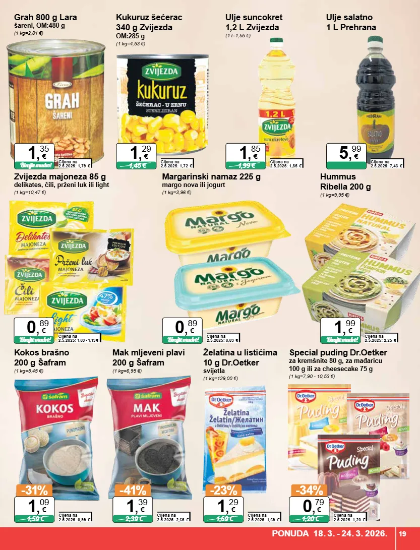 hummus ribella 200 g (1 kg=9,95 €) cijena na 2.5.2025: 2,25 € birajte mudro! 1 , 99 € zvijezda majoneza 85 g delikates, čili, prženi luk ili light (1 kg=10,47 €) cijena na 2.5.2025: 1,09 - 1,19 € birajte mudro! 0 , 89 € margarinski namaz 225 g margo nova ili jogurt (1 kg=3,96 €) cijena na 2.5.2025: 0,89 € birajte mudro! 0 , 89 € ulje suncokret 1,2 l zvijezda (1 l=1,55 €) ulje salatno 1 l prehrana cijena na 2.5.2025: 7,43 € 5 , 99 € grah 800 g lara šareni, om:480 g (1 kg=2,81 €) cijena na 2.5.2025: 1,79 € birajte mudro! 1 , 35 € kukuruz šećerac 340 g zvijezda om:285 g (1 kg=4,53 €) cijena na 2.5.2025: 1,72 € 1,45 € 1 , 29 € kokos brašno 200 g šafram (1 kg=5,45 €) cijena na 2.5.2025: 0,99 € -31% 1,59 € 1 , 09 € mak mljeveni plavi 200 g šafram (1 kg=6,95 €) cijena na 2.5.2025: 2,65 € -41% 2,39 € 1 , 39 € želatina u listićima 10 g dr.oetker svijetla (1 kg=129,00 €) cijena na 2.5.2025: 1,69 € -23% 1,69 € 1 , 29 € cijena na 2.5.2025: 1,85 € 1 , 85 € 1,99 € special puding dr.oetker za kremšnite 80 g, za mađaricu 100 g ili za cheesecake 75 g (1 kg=7,90 - 10,53 €) cijena na 2.5.2025: 1,20 € -34% 1,20 € 0 , 79 € ponuda 18. 3. - 24. 3. 2026. 19