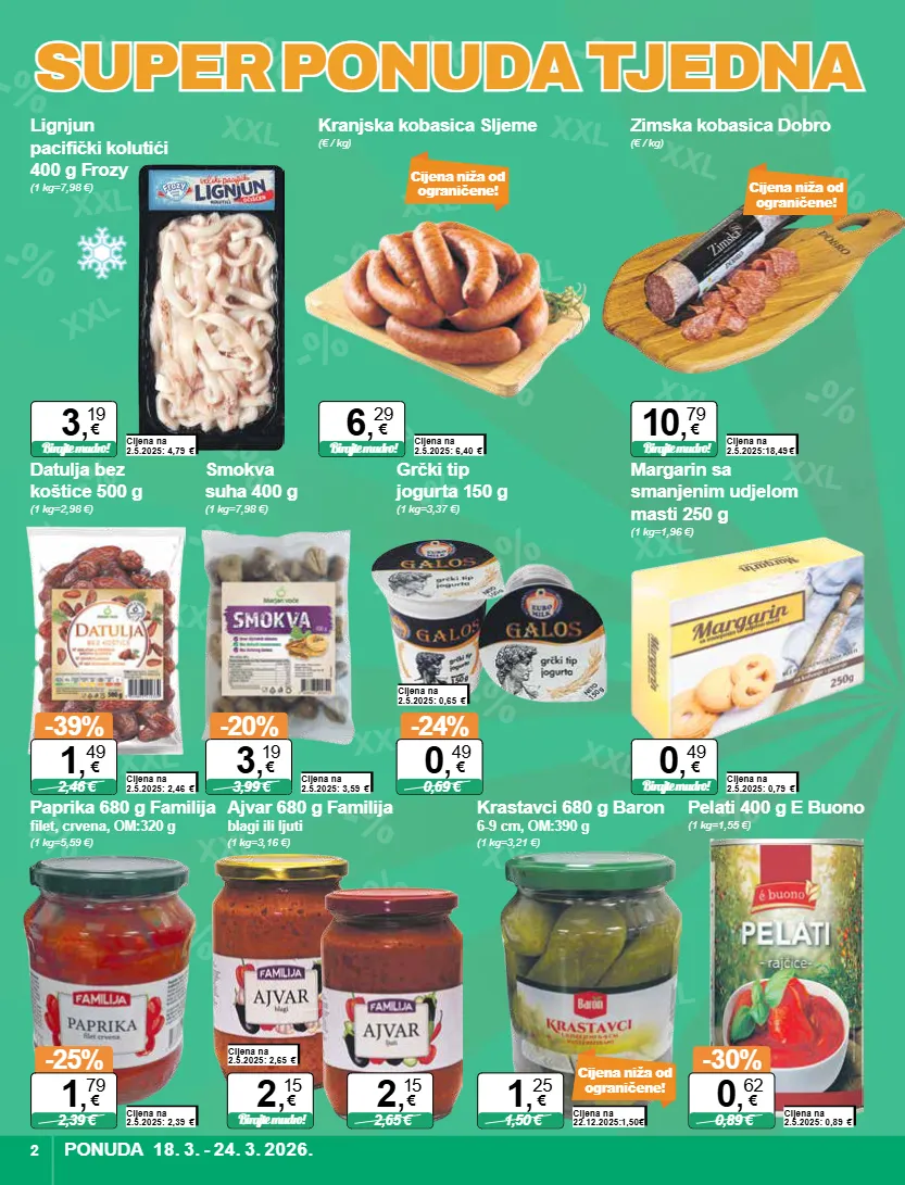 xxl xxl xxl xxl xxl xxl xxl xxl xxl xxl xxl xxl xxl xxl xxl xxl xxl xxl xxl xxl xxl xxl xxl xxl xxl xxl xxl xxl xxl xxl xxl xxl -% -% -% -% -% -% -% % -% -% -% -% % -% -% -% -% -% -% -% -% -% -% -% -% -% -% -% -% -% -% -% -% super ponuda tjedna super ponuda tjedna cijena niža od ograničene! kranjska kobasica sljeme (€ / kg) cijena na 2.5.2025: 6,40 € birajte mudro! 6 , 29 € lignjun pacifički kolutići 400 g frozy (1 kg=7,98 €) margarin sa smanjenim udjelom masti 250 g (1 kg=1,96 €) cijena na 2.5.2025: 4,79 € birajte mudro! 3 , 19 € cijena na 2.5.2025: 0,79 € birajte mudro! 0 , 49 € cijena niža od ograničene! zimska kobasica dobro (€ / kg) cijena na 2.5.2025:18,49 € birajte mudro! 10 , 79 € datulja bez koštice 500 g (1 kg=2,98 €) cijena na 2.5.2025: 2,46 € -39% 2,46 € 1 , 49 € smokva suha 400 g (1 kg=7,98 €) cijena na 2.5.2025: 3,59 € -20% 3,99 € 3 , 19 € cijena niža od ograničene! krastavci 680 g baron 6-9 cm, om:390 g (1 kg=3,21 €) cijena na 22.12.2025:1,50 € 1,50 € 1 , 25 € paprika 680 g familija filet, crvena, om:320 g (1 kg=5,59 €) cijena na 2.5.2025: 2,39 € -25% 2,39 € 1 , 79 € ajvar 680 g familija blagi ili ljuti (1 kg=3,16 €) cijena na 2.5.2025: 2,65 € birajte mudro! 2 , 15 € 2,65 € 2 , 15 € pelati 400 g e buono (1 kg=1,55 €) cijena na 2.5.2025: 0,89 € -30% 0,89 € 0 , 62 € cijena na 2.5.2025: 0,65 € -24% 0,69 € 0 , 49 € grčki tip jogurta 150 g (1 kg=3,37 €) ponuda 18. 3. - 24. 3. 2026. 2