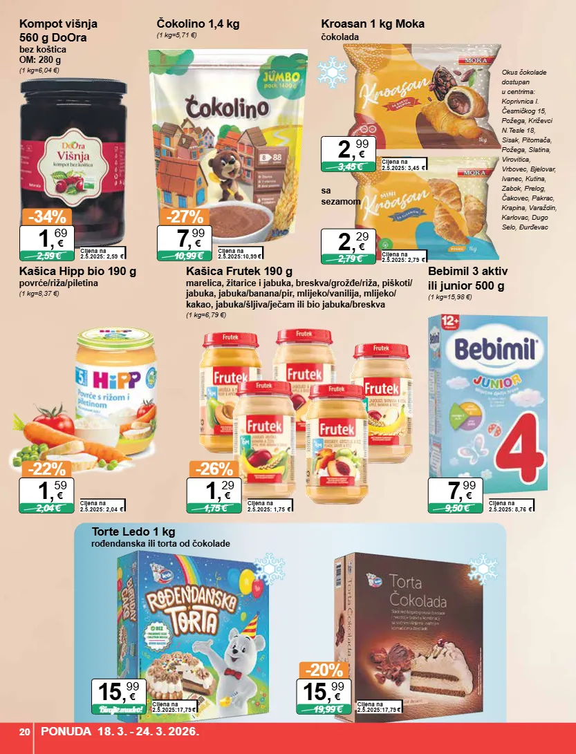 20 ponuda 17.9. - 23.9.2025. čokolino 1,4 kg (1 kg=5,71 €) cijena na 2.5.2025:10,99 € -27% 10,99 € 7 , 99 € bebimil 3 aktiv ili junior 500 g (1 kg=15,98 €) cijena na 2.5.2025: 8,76 € 9,50 € 7 , 99 € kašica hipp bio 190 g povrće/riža/piletina (1 kg=8,37 €) cijena na 2.5.2025: 2,04 € -22% 2,04 € 1 , 59 € torte ledo 1 kg rođendanska ili torta od čokolade cijena na 2.5.2025:17,79 € birajte mudro! 15 , 99 € cijena na 2.5.2025:17,79 € -20% 19,99 € 15 , 99 € kompot višnja 560 g doora bez koštica om: 280 g (1 kg=6,04 €) cijena na 2.5.2025: 2,59 € -34% 2,59 € 1 , 69 € kašica frutek 190 g marelica, žitarice i jabuka, breskva/grožđe/riža, piškoti/ jabuka, jabuka/banana/pir, mlijeko/vanilija, mlijeko/ kakao, jabuka/šljiva/ječam ili bio jabuka/breskva (1 kg=6,79 €) cijena na 2.5.2025: 1,75 € -26% 1,75 € 1 , 29 € okus čokolade dostupan u centrima: koprivnica i. česmičkog 15, požega, križevci n.tesle 18, sisak, pitomača, požega, slatina, virovitica, vrbovec, bjelovar, ivanec, kutina, zabok, prelog, čakovec, pakrac, krapina, varaždin, karlovac, dugo selo, đurđevac sa sezamom čokolada kroasan 1 kg moka cijena na 2.5.2025: 3,45 € 3,45 € 2 , 99 € cijena na 2.5.2025: 2,79 € 2,79 € 2 , 29 € ponuda 18. 3. - 24. 3. 2026. 20