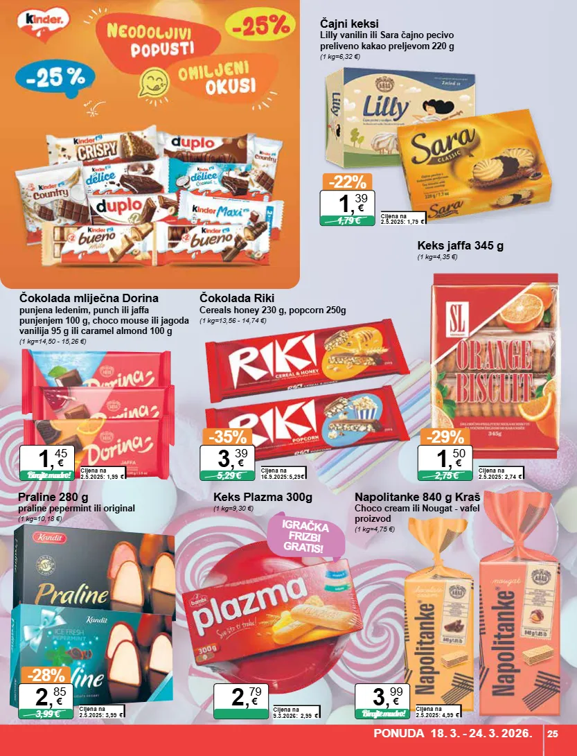cijena na 9.3.2026: 2,99 € keks plazma 300g (1 kg=9,30 €) 2 , 79 € praline 280 g praline pepermint ili original (1 kg=10,18 €) cijena na 2.5.2025: 3,99 € -28% 3,99 € 2 , 85 € keks jaffa 345 g (1 kg=4,35 €) cijena na 2.5.2025: 2,74 € -29% 2,75 € 1 , 50 € čokolada riki cereals honey 230 g, popcorn 250g (1 kg=13,56 - 14,74 €) cijena na 16.9.2025:5,29 € -35% 5,29 € 3 , 39 € čokolada mliječna dorina punjena ledenim, punch ili jaffa punjenjem 100 g, choco mouse ili jagoda vanilija 95 g ili caramel almond 100 g (1 kg=14,50 - 15,26 €) cijena na 2.5.2025: 1,99 € birajte mudro! 1 , 45 € čajni keksi lilly vanilin ili sara čajno pecivo preliveno kakao preljevom 220 g (1 kg=6,32 €) cijena na 2.5.2025: 1,79 € -22% 1,79 € 1 , 39 € napolitanke 840 g kraš choco cream ili nougat - vafel proizvod (1 kg=4,75 €) cijena na 2.5.2025: 4,99 € birajte mudro! 3 , 99 € igračka frizbi gratis! ponuda 18. 3. - 24. 3. 2026. 25