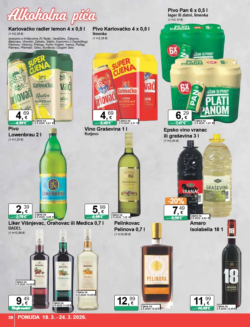 karlovačko radler lemon 4 x 0,5 l (1 l=2,35 €) cijena na 2.5.2025: 5,61 € 4,99 € 4 , 69 € pivo karlovačko 4 x 0,5 l limenka (1 l=2,35 €) cijena na 2.5.2025: 5,31 € 5,49 € 4 , 69 € pivo pan 6 x 0,5 l lager ili zlatni, limenka (1 l=2,10 €) cijena na 2.5.2025: 7,47 € 7,47 € 6 , 29 € pivo lowenbrau 2 l (1 l=1,20 €) cijena na 2.5.2025: 2,68 € 2,79 € 2 , 39 € vino graševina 1 l kutjevo cijena na 2.5.2025: 7,02 € 6,99 € 5 , 99 € epsko vino vranac ili graševina 3 l (1 l=2,50 €) cijena na 2.5.2025: 8,62 € -20% 9,39 € 7 , 49 € pelinkovac pelinova 0,7 l (1 l=18,56 €) cijena na 2.5.2025:15,02 € 12 , 99 € cijena na 2.5.2025:10,52 € cijena na 2.5.2025:11,02 € cijena na 2.5.2025:10,65 € amaro isolabella 18 1 cijena na 2.5.2025:14,49 € 14,49 € 11 , 99 € liker višnjevac, orahovac ili medica 0,7 l badel (1 l=13,56 €) birajte mudro! 9 , 49 € dostupno u križevcima (n.tesle), varaždinu, čakovcu, bjelovaru, virovitici, zaboku, slatini, koprivnici (i.česmičkog), karlovcu, vrbovcu, prelogu, kutini, krapini, ivancu, požegi, pakracu, pitomači, sisku, đurđevcu i dugom selu ponuda 18. 3. - 24. 3. 2026. 28 alkoholna pića alkoholna pića