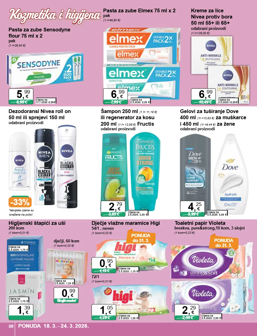 *akcijske cijene su izražene na polici -33% pasta za zube elmex 75 ml x 2 pak (1 l=46,60 €) cijena na 2.5.2025: 8,99 € 7,99 € 6 , 99 € pasta za zube sensodyne flour 75 ml x 2 pak (1 l=39,93 €) cijena na 11.7.2026: 6,99 € 6,99 € 5 , 99 € šampon 250 ml (1 l= 11,16 €) ili regenerator za kosu 200 ml (1 l= 13,95 €) fructis odabrani proizvodi cijena na 2.5.2025: 3,59 € 3,85 € 2 , 79 € dezodoransi nivea roll on 50 ml ili sprejevi 150 ml odabrani proizvodi kreme za lice nivea protiv bora 50 ml 55+ ili 65+ odabrani proizvodi (1 l=139,80 €) cijena na 2.5.2025:10,99 € 10,49 € 6 , 99 € gelovi za tuširanje dove 400 ml (1l =10,63 €) za muškarce i 450 ml (1l =9,44 €) za žene odabrani proizvodi cijena na 2.5.2025: 5,99 € 5,99 € 4 , 25 € ponuda do 31. 3. ponuda do 31. 3. toaletni papir violeta breskva, pure&strong,10 kom, 3 slojni (1 kom=0,23 €) cijena na 2.5.2025: 2,99 € 2,59 € 2 , 29 € higijenski štapići za uši 200 kom (1 kom=0,01 €) 1 , 39 € dječji, 60 kom (1 kom=0,02 €) cijena na 2.5.2025: 1,35 € birajte mudro! 0 , 99 € cijena na 2.5.2025: 1,79 € cijena na 2.5.2025: 1,75 € dječje vlažne maramice higi 54/1 , neven (1 kom=0,02 €) cijena na 2.5.2025: 1,19 € 1,19 € 0 , 95 € 72/1 (1 kom=0,01 €) cijena na 2.5.2025: 1,29 € 1,29 € 1 , 05 € ponuda 18. 3. - 24. 3. 2026. 30 kozmetika i higijena kozmetika i higijena