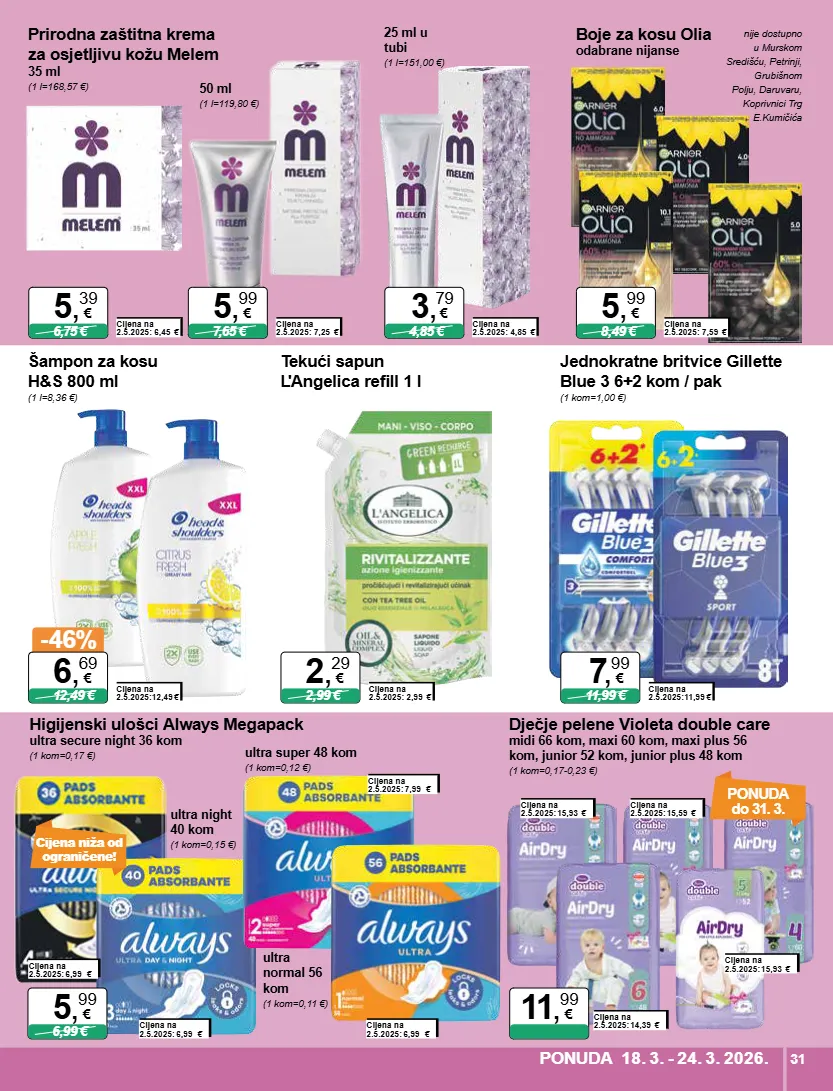 prirodna zaštitna krema za osjetljivu kožu melem 35 ml (1 l=168,57 €) cijena na 2.5.2025: 6,45 € 6,75 € 5 , 39 € cijena na 2.5.2025: 7,25 € 7,65 € 5 , 99 € 25 ml u tubi (1 l=151,00 €) 50 ml (1 l=119,80 €) cijena na 2.5.2025: 4,85 € 4,85 € 3 , 79 € boje za kosu olia odabrane nijanse cijena na 2.5.2025: 7,59 € 8,49 € 5 , 99 € šampon za kosu h&s 800 ml (1 l=8,36 €) cijena na 2.5.2025:12,49 € -46% 12,49 € 6 , 69 € nije dostupno u murskom središću, petrinji, grubišnom polju, daruvaru, koprivnici trg e.kumičića jednokratne britvice gillette blue 3 6+2 kom / pak (1 kom=1,00 €) cijena na 2.5.2025:11,99 € 11,99 € 7 , 99 € tekući sapun l'angelica refill 1 l cijena na 2.5.2025: 2,99 € 2,99 € 2 , 29 € ponuda do 31. 3. dječje pelene violeta double care midi 66 kom, maxi 60 kom, maxi plus 56 kom, junior 52 kom, junior plus 48 kom (1 kom=0,17-0,23 €) 11 , 99 € cijena niža od ograničene! higijenski ulošci always megapack ultra secure night 36 kom (1 kom=0,17 €) cijena na 2.5.2025: 6,99 € cijena na 2.5.2025: 6,99 € cijena na 2.5.2025: 6,99 € cijena na 2.5.2025: 15,93 € cijena na 2.5.2025: 15,93 € cijena na 2.5.2025: 15,59 € cijena na 2.5.2025: 14,39 € cijena na 2.5.2025: 7,99 € 6,99 € 5 , 99 € ultra night 40 kom (1 kom=0,15 €) ultra super 48 kom (1 kom=0,12 €) ultra normal 56 kom (1 kom=0,11 €) ponuda 18. 3. - 24. 3. 2026. 31