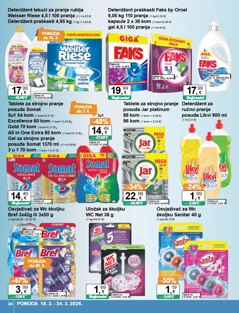 cijena na 1. 10. 2025: 31,99 € cijena na 23. 10. 2025:25,99 € cijena na 20. 11. 2025: 25,99 € deterdžent tekući za pranje rublja weisser riese 4,5 l 100 pranja (1 l =4,00 €) deterdžent praškasti 4,95 kg (1 kg = 3,63 €) cijena na 2.5.2025:25,99 € 18,99 € 17 , 99 € deterdžent praškasti faks by ornel 6,05 kg 110 pranja (1 kg=3,30 €) kapsule 2 x 36 kom (1 kom=0,28 €) gel 4,5 l 100 pranja (1 l=4,44 €) birajte mudro! 19 , 99 € birajte mudro! 17 , 99 € ponuda do 31. 3. ponuda do 7. 4. tablete za strojno pranje posuđa somat 5u1 54 kom (1 kom=0,27 €) excellence 60 kom (1 kom= 0,24 €) , gold 70 kom (1kom=0,21 €) , all in one extra 85 kom (1 kom=0,18 €) , gel za strojno pranje posuđa somat 1370 ml (1l =10,58 €) 3 u 1 70 kom ( 1 kom = 0,21 €) cijena na 2.5.2025:14,49 € birajte mudro! 14 , 49 € 3u1 cijena na 2.5.2025: 27,99 € -48% 27,99 € 14 , 49 € deterdžent za ručno pranje posuđa likvi 900 ml (1 l=2,21 €) cijena na 2.5.2025: 2,65 € -24% 2,65 € 1 , 99 € tablete za strojno pranje posuđa jar platinum 88 kom (1 kom = 0,26 €) 96 kom (1 kom = 0,24 €) cijena na 10.3.2025:34,99 € -34% 34,99 € 22 , 99 € osvježivač za wc školjku bref 3x42g ili 3x50 g (1 kg=26,60 - 31,67 €) cijena na 2.5.2025: 7,59 € -47% 7,59 € 3 , 99 € cijena na 14.1.2026:7,59 € ponuda do 30. 3. uložak za školjku wc net 38 g (1 kg=44,47 €) cijena na 2.5.2025: 3,39 € birajte mudro! 1 , 69 € osvježivač za wc školjku sanitar 40 g (1 kg=29,75 €) cijena na 2.5.2025: 2,65 € -55% 2,65 € 1 , 19 € ponuda 18. 3. - 24. 3. 2026. 34
