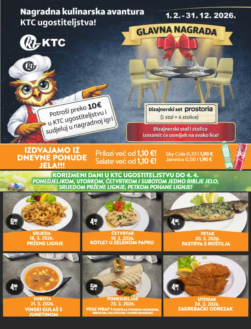 četvrtak 19. 3. 2026. zelena tjestenina s plodovima mora utorak 24. 3. 2026. ponedjeljak 23. 3. 2026. subota 21. 3. 2026. vege wrap 1 (tortilla punjena humusom, rikolom, falafelom i tahini umakom) zagrebački odrezak vinski gulaš s junetinom izdvajamo iz dnevne ponude jela!!! petak 20. 3. 2026. pastrva s roštilja 6 , 90 € 4 , 30 € 4 , 60 € 4, 80 € 4 , 90 € srijeda 18. 3. 2026. kotlet u zelenom papru pržene lignje sky cola 0,33 l 1,90 € jamnica 0,50 l 1,90 € prilozi već od 1,10 €! salate već od 1,10 €! 5 , 00 € korizmeni dani u ktc ugostiteljstvu do 4. 4. ponedjeljkom, utorkom, četvrtkom i subotom jedno riblje jelo; srijedom pržene lignje; petkom pohane lignje!