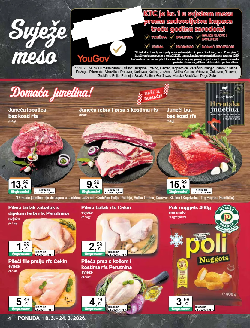 svježe meso u mesnicama: križevci, krapina, prelog, pakrac, koprivnica, varaždin, ivanec, zabok, slatina, požega, pitomača, virovitica, daruvar, karlovac, kutina, jalžabet, velika gorica, vrbovec, čakovec, bjelovar, grubišno polje, petrinja, sisak, slatina, đurđevac, mursko središće i dugo selo ktc je br. 1 u svježem mesu ktc je br. 1 u svježem mesu prema zadovoljstvu kupaca prema zadovoljstvu kupaca treću godinu zaredom! treću godinu zaredom! *rezultat se temelji na izjavljenom zadovoljstvu kupaca. yougov „fresh perception”, istraživanje provedeno u veljači 2025. na nacionalno reprezentativnom uzorku 1200 kućanstava na nivou cijele hrvatske. kupci ocjenjuju nespecijalizirane trgovce na malo pretežno hranom, pićima i duhanskim proizvodima. domaći proizvodi domaći proizvodi omjer cijene i omjer cijene i kvalitete kvalitete prodavač prodavač kvaliteta kvaliteta svježina svježina cijena cijena potvrdili kupci *domaća junetina nije dostupna u centrima jalžabet, grubišno polje, petrinja, velika gorica, daruvar, slatina i koprivnica (trg eugena kumičića) cijena na 2.5.2025: 11,99€ cijena na 2.5.2025: 10,99€ cijena na 2.5.2025: 7,99€ juneći but bez kosti rfs (€/kg) juneća lopatica bez kosti rfs (€/kg) juneća rebra i prsa s kostima rfs (€/kg) 15 , 99 € birajte mudro! 13 , 99 € birajte mudro! 9 , 99 € birajte mudro! pileći file prsiju rfs cekin svježe (€ / kg) cijena na 2.5.2025: 7,99 € birajte mudro! 5 , 49 € pileći batak rfs cekin svježe (€ / kg) cijena na 2.5.2025: 3,99 € birajte mudro! 2 , 59 € pileći batak zabatak s dijelom leđa rfs perutnina svježe (€ / kg) cijena na 2.5.2025: 2,99 € birajte mudro! 1 , 99 € pileća prsa s kožom i kostima rfs perutnina svježe (€ / kg) cijena na 2.5.2025: 4,99 € birajte mudro! 4 , 79 € poli nuggets 400g smrznuto (1 kg=9,98 €) cijena na 2.5.2025: 4,99 € birajte mudro! 3 , 99 € ponuda 18. 3. - 24. 3. 2026. 4 svježe meso domaća junetina! domaća junetina! domaća junetina! domaća junetina!