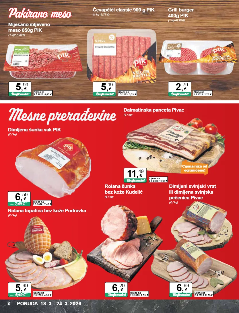 cijena niža od ograničene! miješano mljeveno meso 850g pik (1 kg=7,05 €) ćevapčići classic 900 g pik (1 kg=5,77 €) grill burger 400g pik (1 kg=6,98 €) cijena na 2.5.2025: 6,69 € birajte mudro! 5 , 99 € cijena na 2.5.2025: 5,99 € birajte mudro! 5 , 19 € cijena na 2.5.2025: 2,79 € birajte mudro! 2 , 79 € dimljeni svinjski vrat ili dimljena svinjska pečenica pivac (€ / kg) cijena na 2.5.2025:11,99 € birajte mudro! 6 , 99 € dalmatinska panceta pivac (€ / kg) cijena na 2.5.2025:11,90 € birajte mudro! 11 , 49 € dimljena šunka vak pik (€ / kg) cijena na 2.3.2026: 7,49 € 7,49 € 6 , 59 € rolana šunka bez kože kudelić (€ / kg) cijena na 2.5.2025: 6,99 € birajte mudro! 6 , 29 € rolana lopatica bez kože podravka (€ / kg) cijena na 2.5.2025: 4,99 € 6,49 € 5 , 99 € ponuda 18. 3. - 24. 3. 2026. 6 mesne prerađevine pakirano meso pakirano meso
